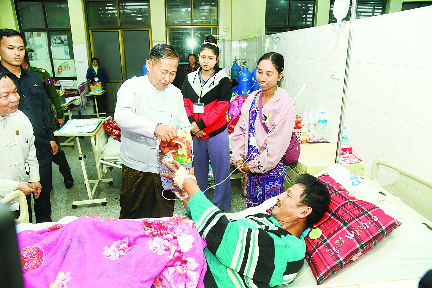 ဆက်လက်၍ ကော်မရှင်ဒုတိယဥက္ကဋ္ဌ ဒုတိယတပ်မတော်ကာကွယ်ရေးဦးစီးချုပ် ကာကွယ်ရေးဦးစီးချုပ်(ကြည်း) ဒုတိယ ဗိုလ်ချုပ်မှူးကြီး စိုးဝင်းနှင့်အဖွဲ့ဝင်များသည် မြစ်ကြီးနားမြို့ ပြည်သူ့ဆေးရုံသို့သွားရောက်၍ ဆေးရုံ၌ဆေးကုသမှု ခံယူလျက်ရှိသည့် ဒေသခံတိုင်းရင်းသား ပြည်သူများအား လိုက်လံကြည့်ရှု၍ တစ်ဦးချင်း၏ ရောဂါဖြစ်ပွားမှုနှင့် ဆေးဝါးကုသ ပေးလျက်ရှိသည့် အခြေအနေများအားမေးမြန်း၍ အားပေးစကားပြောကြားကာ စားသောက်ဖွယ်ရာများကိုလည်းကောင်း၊ ကျန်းမာရေးဝန်ထမ်းများအတွက် ချီးမြှင့် ငွေများကိုလည်းကောင်း ပေးအပ်သည်။