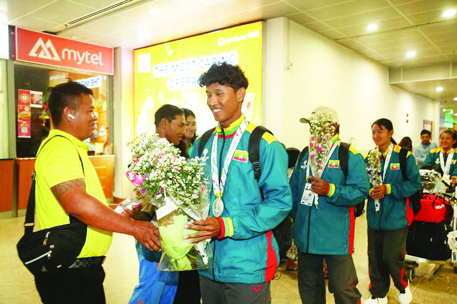 အဆိုပါအားကစားအဖွဲ့ဝင်များသည် ယနေ့တွင် အပြည်ပြည်ဆိုင်ရာ မြန်မာ့လေကြောင်း လိုင်း (MAI) ဖြင့် ရန်ကုန်မြို့သို့ ပြန်လည်ရောက်ရှိလာရာ အားကစားနှင့် ကာယပညာဦးစီးဌာနမှ တာဝန်ရှိပုဂ္ဂိုလ်များ၊ ပြိုင်ပွဲဝင်အားကစားသမားများ၏ မိဘဆွေမျိုးများက ဂုဏ်ပြုကြိုဆိုကြသည်။
