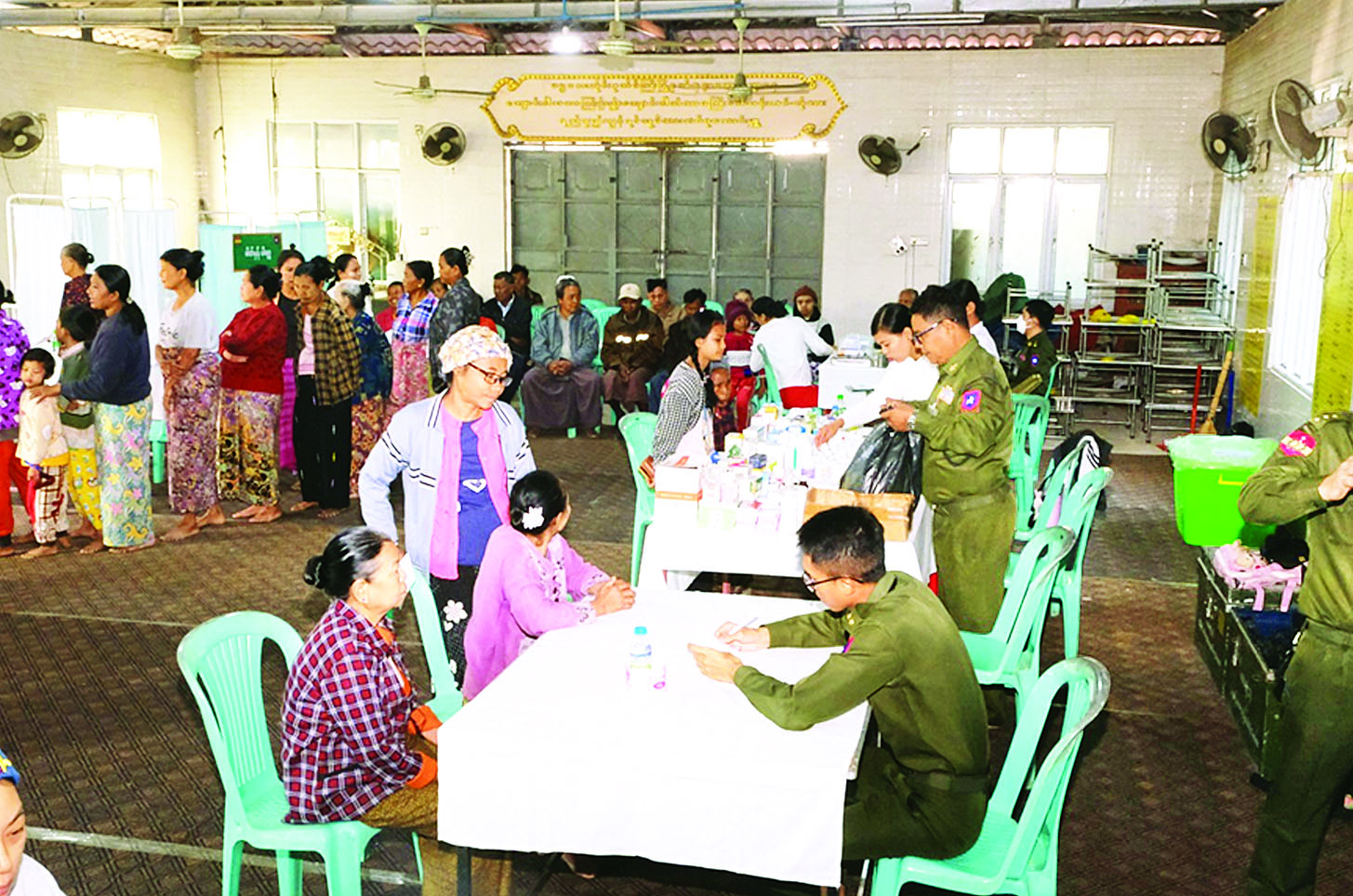 အလားတူ ယနေ့နံနက်ပိုင်းတွင်လည်း အလယ်ပိုင်းတိုင်း စစ်ဌာနချုပ် နယ်လှည့်ဆေးကုသရေးအဖွဲ့က မန္တလေးတိုင်းဒေသကြီး အောင်မြေသာစံမြို့နယ် ဘုန်းတော်တိုးရပ်ကွက်နှင့် ပတ်ဝန်းကျင် ရပ်ကွက်များရှိ ဒေသခံပြည်သူများအား အဆိုပါရပ်ကွက်ရှိ ပထမဝေဠုဝန်ကျောင်းတိုက်၌ ကျန်းမာရေးစောင့်ရှောက်မှုလုပ်ငန်းများ ဆောင်ရွက်ပေး သည်။