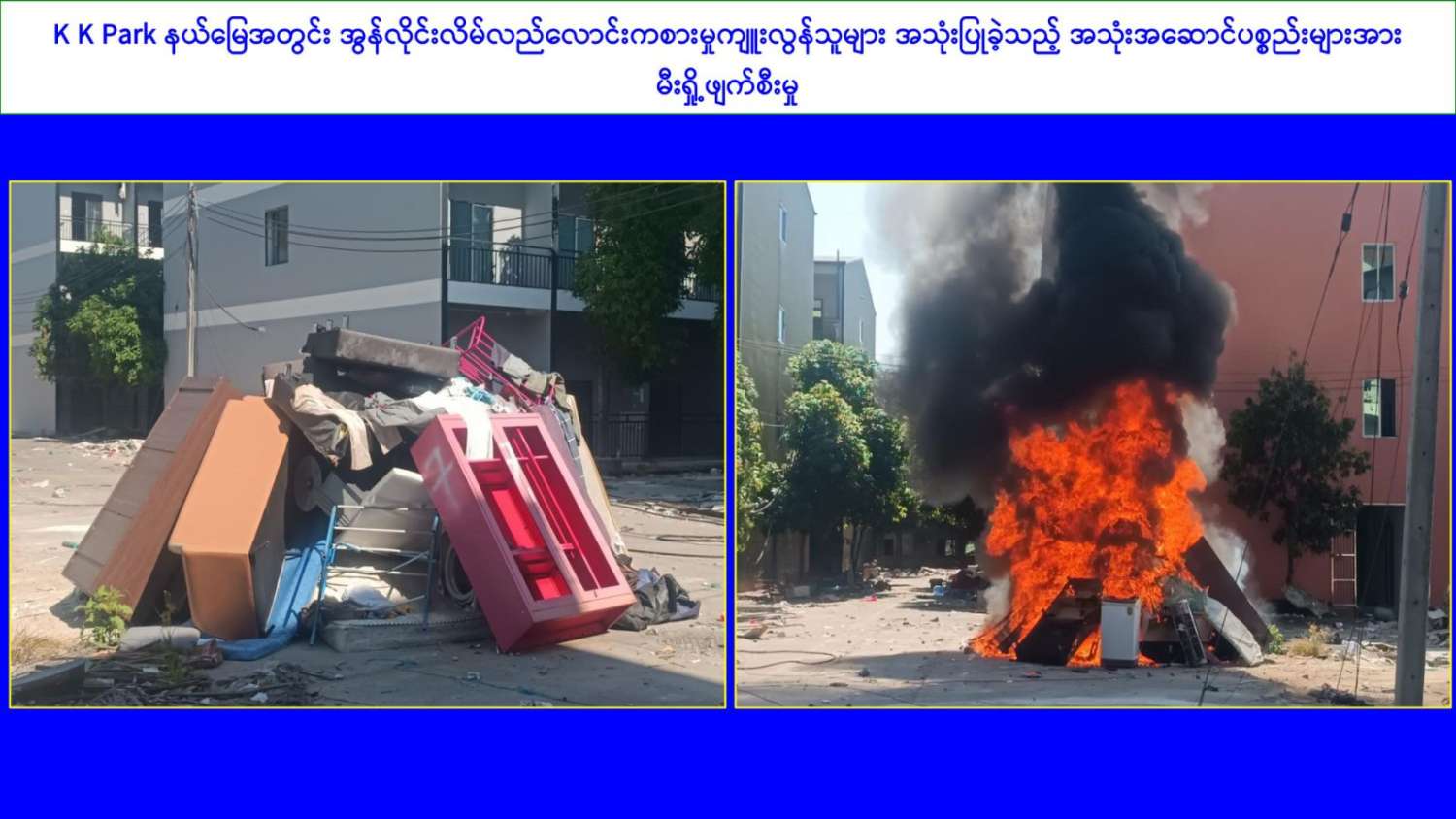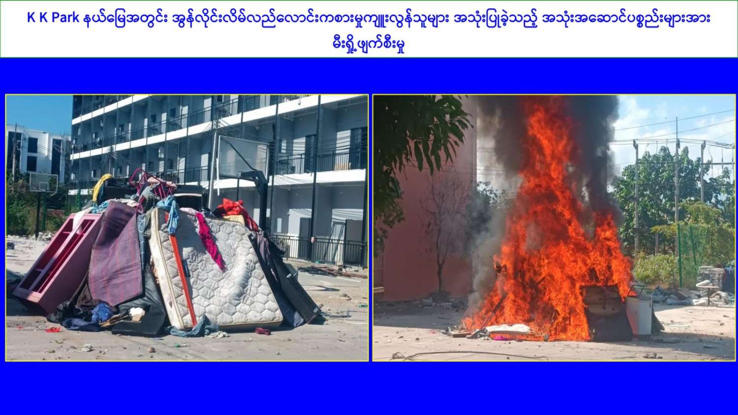 ၎င်းအပြင် KK park နှင့် ရွှေကုက္ကိုလ်နယ်မြေရှိ အွန်လိုင်းလိမ်လည်လောင်းကစားမှုကျူးလွန်ရာတွင် အသုံးပြုခဲ့သည့်ပစ္စည်းများအား ထပ်မံအသုံးပြုမှုမရှိစေရေးအတွက် ယနေ့တွင်လည်း စနစ်တကျမီးရှို့ဖျက်ဆီးခဲ့ကြောင်းနှင့် နိုင်ငံတော်အစိုးရအနေဖြင့် အွန်လိုင်းလိမ်လည်လောင်းကစားမှုကျူးလွန်မှုများကို အမျိုးသားရေးတာဝန်တစ်ရပ်အဖြစ် ခံယူကာ မြန်မာနိုင်ငံအတွင်း လုံးဝအခြေမပြုနိုင်ရေး ပြည်တွင်းအင်အားစုများအပြင် အိမ်နီးချင်းနိုင်ငံအစိုးရများနှင့်လည်း ပေါင်းစပ်ညှိနှိုင်း၍ ဆက်လက်ဆောင်ရွက်သွားမည်ဖြစ်ကြောင်း သတင်းရရှိသည်။