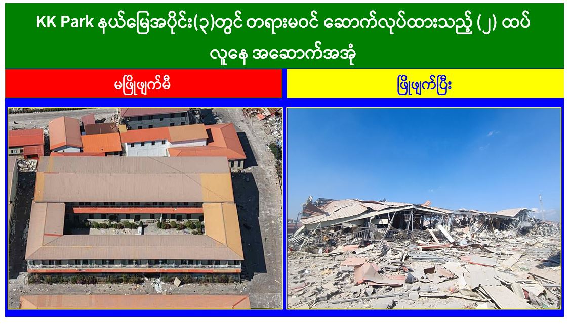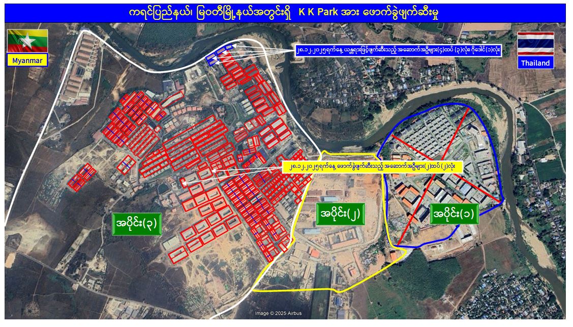 ယနေ့တွင် မြဝတီ-မဲထော်သလေး(KK Park)အပိုင်း(၃)နယ်မြေအတွင်းရှိ အွန်လိုင်းလိမ်လည်လောင်းကစားမှုများကျူးလွန်ရာတွင် အသုံးပြုခဲ့သည့် တရားမဝင် ၄ ထပ် အဆောက်အအုံ ၃ လုံး၊ ၂ ထပ်အဆောက်အအုံ ၂ လုံးနှင့် ဂိုဒေါင် ၁ လုံး၊ စုစုပေါင်း တရားမဝင်အဆောက်အအုံ ၆ လုံးတို့ကို ထပ်မံဖြိုချဖျက်ဆီးခဲ့သဖြင့် KK Park နယ်မြေအတွင်းရှိ တရားမဝင်အဆောက်အအုံ စုစုပေါင်း ၆၃၅ လုံး အနက် ၅၁၅ လုံးကို စနစ်တကျ ဖြိုချဖျက်ဆီးပြီးဖြစ်ကြောင်း သိရှိရသည်။