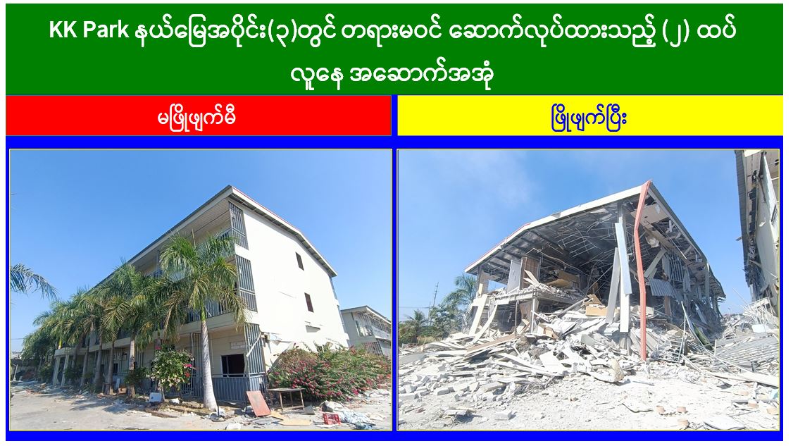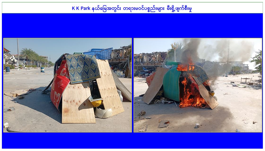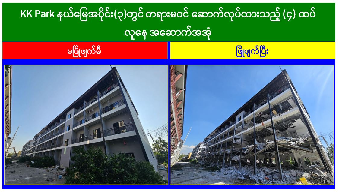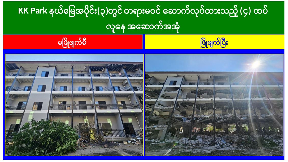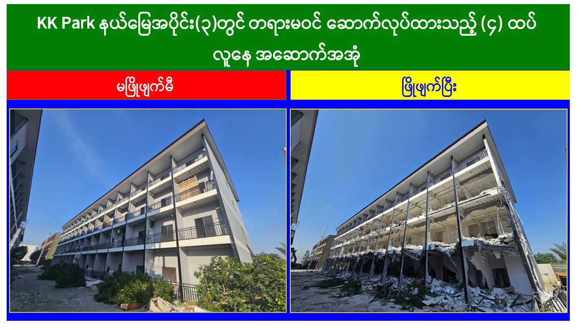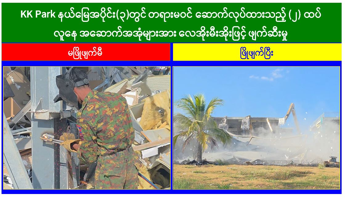 မြန်မာနိုင်ငံအစိုးရအနေဖြင့် အွန်လိုင်းလိမ်လည်လောင်းကစားမှုများ အများဆုံးအခြေချလုပ်ကိုင်လျက်ရှိကြသည့် ရွှေကုက္ကိုလ်နယ်မြေနှင့် KK Park နယ်မြေများရှိ တရားမဝင်အဆောက်အအုံများအတွင်း ဝင်ရောက်ရှင်းလင်းခြင်း၊ အွန်လိုင်းလိမ်လည် လောင်းကစားမှုလုပ်ငန်းစဉ်များတွင် အသုံးပြုခဲ့သည့် သိမ်းဆည်းရမိပစ္စည်းများနှင့် တရားမဝင်အဆောက်အအုံများအား စနစ်တကျဖြိုချဖျက်ဆီးခြင်းများကို လုံခြုံရေးတပ်ဖွဲ့ဝင်များ၊ အုပ်ချုပ်ရေးအဖွဲ့အစည်းများနှင့် ဒေသတွင်းတာဝန်ရှိသူများအပါအဝင် အဖွဲ့စုံပါဝင်သည့် ပူးပေါင်းအဖွဲ့ဖြင့် ဆောင်ရွက်လျက်ရှိရာ ယနေ့တွင် KK Park နယ်မြေအတွင်းရှိ တရားမဝင်အဆောက်အအုံ ၆ လုံးကို ထပ်မံဖြိုချဖျက်ဆီးခဲ့ကြောင်း သိရှိရသည်။