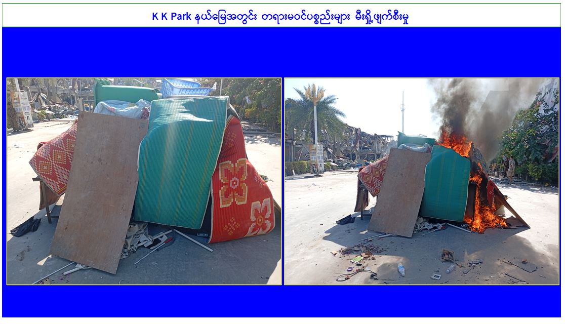 ၎င်းအပြင် KK park နယ်မြေနှင့်ရွှေကုက္ကိုလ်နယ်မြေအတွင်းရှိ အွန်လိုင်းလိမ်လည်လောင်းကစားမှုကျူးလွန်ရာတွင် အသုံးပြုခဲ့သည့်ပစ္စည်းများအား ထပ်မံအသုံးပြုမှုမရှိစေရေးအတွက် ယနေ့တွင်လည်း စနစ်တကျမီးရှို့ဖျက်ဆီးခဲ့ကြောင်းနှင့် နိုင်ငံတော်အစိုးရအနေဖြင့် အွန်လိုင်းလိမ်လည်လောင်းကစားမှုကျူးလွန်မှုများကို အမျိုးသားရေးတာဝန်တစ်ရပ်အဖြစ်ခံယူကာ မြန်မာနိုင်ငံအတွင်း လုံးဝအခြေမပြုနိုင်ရေး ပြည်တွင်းအင်အားစုများအပြင် အိမ်နီးချင်းနိုင်ငံအစိုးရများနှင့်လည်း ပေါင်းစပ်ညှိနှိုင်း၍ ဆက်လက်ဆောင်ရွက်သွားမည်ဖြစ်ကြောင်း သတင်းရရှိသည်။