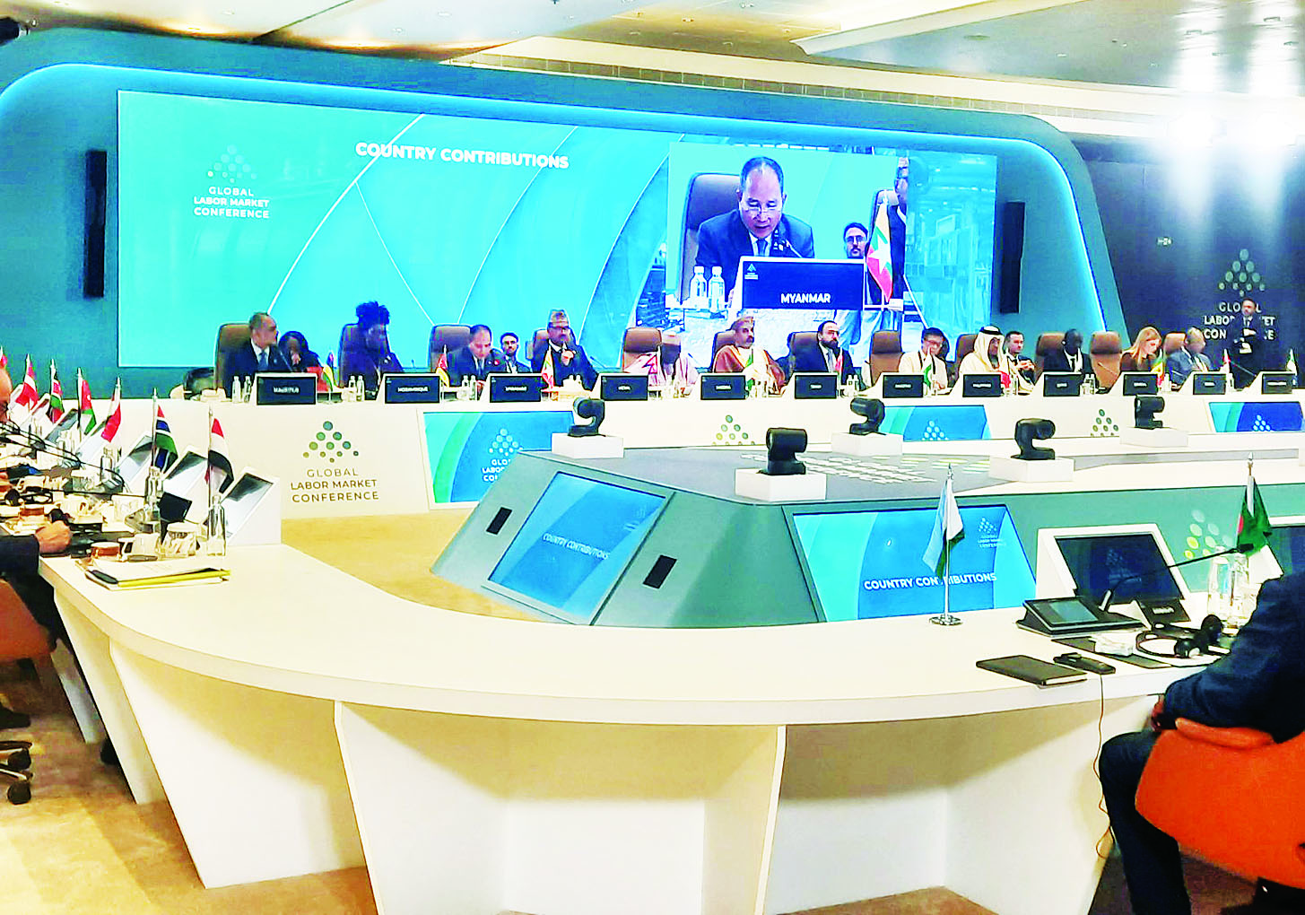ထို့နောက် ဝန်ကြီးအဆင့် စားပွဲဝိုင်းဆွေးနွေးပွဲကို “From Policy to Practice: Opening Immediate Pathways to Work Amid Rapid Change” ခေါင်းစဉ်ဖြင့်ကျင်းပရာ ပြည်ထောင်စုဝန်ကြီးက ကမ္ဘာလုံးဆိုင်ရာ အလုပ်သမားဈေးကွက်ညီလာခံကို ၂၀၂၃ ခုနှစ်တွင် လူငယ်များကို နည်းပညာအတွက် ပြင်ဆင်ပေးရန် စတင်ကျင်းပပြုလုပ်ခဲ့ပြီး ၂၀၂၅ ခုနှစ် ညီလာခံတွင်ထိရောက်သည့် လုပ်ဆောင်ချက် (၈) ရပ်ကို ချမှတ်နိုင်ခဲ့သည်ကို သိရှိရပါကြောင်း၊ ဖွံ့ဖြိုးဆဲနိုင်ငံများအတွက် စိန်ခေါ်မှုမှာ အနာဂတ် စီမံကိန်းချမှတ်နေရန်သာမဟုတ်တော့ဘဲ တိုးတက်ပြောင်းလဲလာသည့် အလိုအလျောက်စနစ်များ၊ ရာသီဥတုပြောင်းလဲမှုများနှင့် စီးပွားရေးဖိအားများကို လက်တွေ့ကျကျ တုံ့ပြန်နိုင်မည့် ဆောင်ရွက်ချက် များကို အကောင်အထည်ဖော်ရန် လိုအပ်နေပြီဖြစ်ပါကြောင်း၊ မြန်မာနိုင်ငံအနေဖြင့် မူဝါဒများကိုလက်တွေ့ အဖြစ်ပြောင်းလဲရန် အောက်ပါအဓိကနယ်ပယ် လေးခုကို ဦးစားပေးဆောင်ရွက်လျက်ရှိပါကြောင်း၊ ပထမဦးစွာ အလုပ်အကိုင်အခွင့်အလမ်းများကို လူတိုင်းလက်လှမ်းမီပါဝင်လာစေရန် စနစ်တကျ စုစည်းထားမှုမရှိသောကဏ္ဍ (Informal Sector) မှ စီးပွားရေးလုပ်ငန်းများကို စနစ်တကျစုစည်းမှတ်ပုံ တင်ထားသောကဏ္ဍ (Formal Sector) သို့ ပြောင်းလဲနိုင်ရေး ကြိုးပမ်းလျက်ရှိပါကြောင်း။