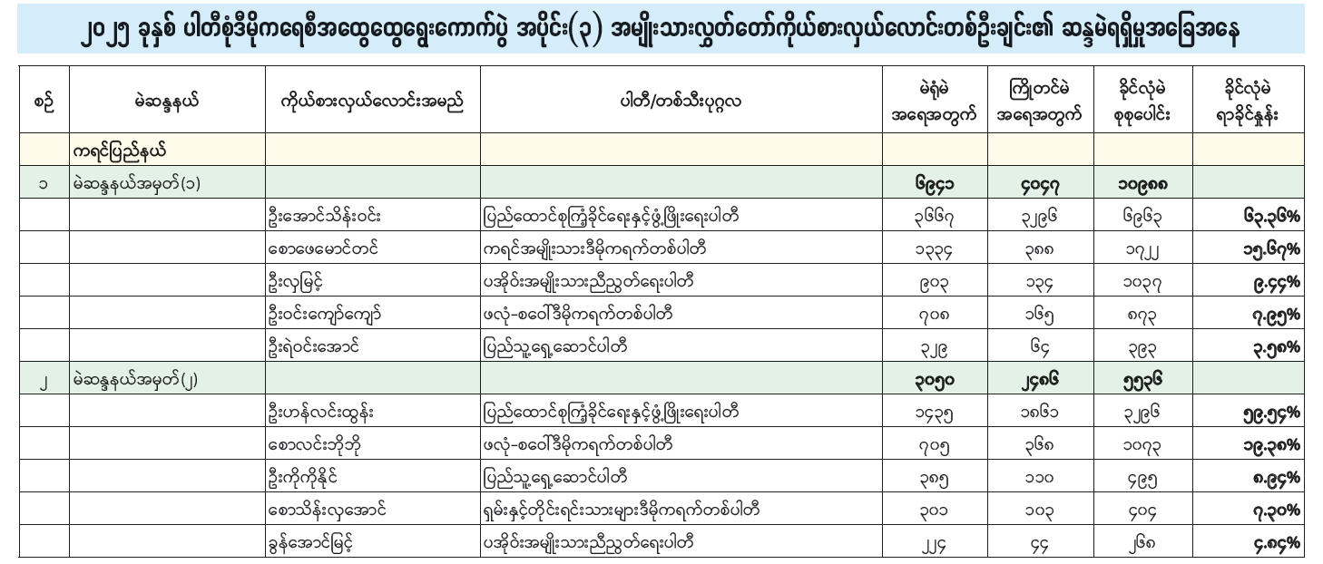 ၂၀၂၅ ခုနှစ် ပါတီစုံဒီမိုကရေစီအထွေထွေရွေးကောက်ပွဲ အပိုင်း(၃) အမျိုးသားလွှတ်တော်ကိုယ်စားလှယ်လောင်းတစ်ဦးချင်း၏ ဆန္ဒမဲရရှိမှုအခြေအနေ