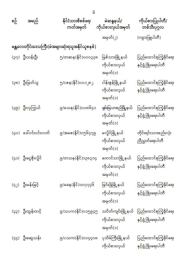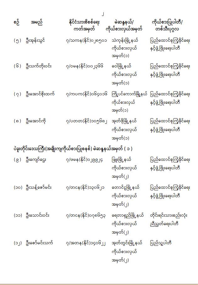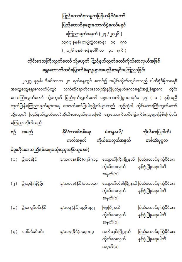 တိုင်းဒေသကြီးလွှတ်တော် သို့မဟုတ် ပြည်နယ်လွှတ်တော်ကိုယ်စားလှယ်အဖြစ် ရွေးကောက်တင်မြှောက်ခံရသူများ အမည်စာရင်းကြေညာခြင်း 01/31/2026 တိုင်းဒေသကြီးလွှတ်တော် သို့မဟုတ် ပြည်နယ်လွှတ်တော်ကိုယ်စားလှယ်အဖြစ် ရွေးကောက်တင်မြှောက်ခံရသူများ အမည်စာရင်းကြေညာခြင်း