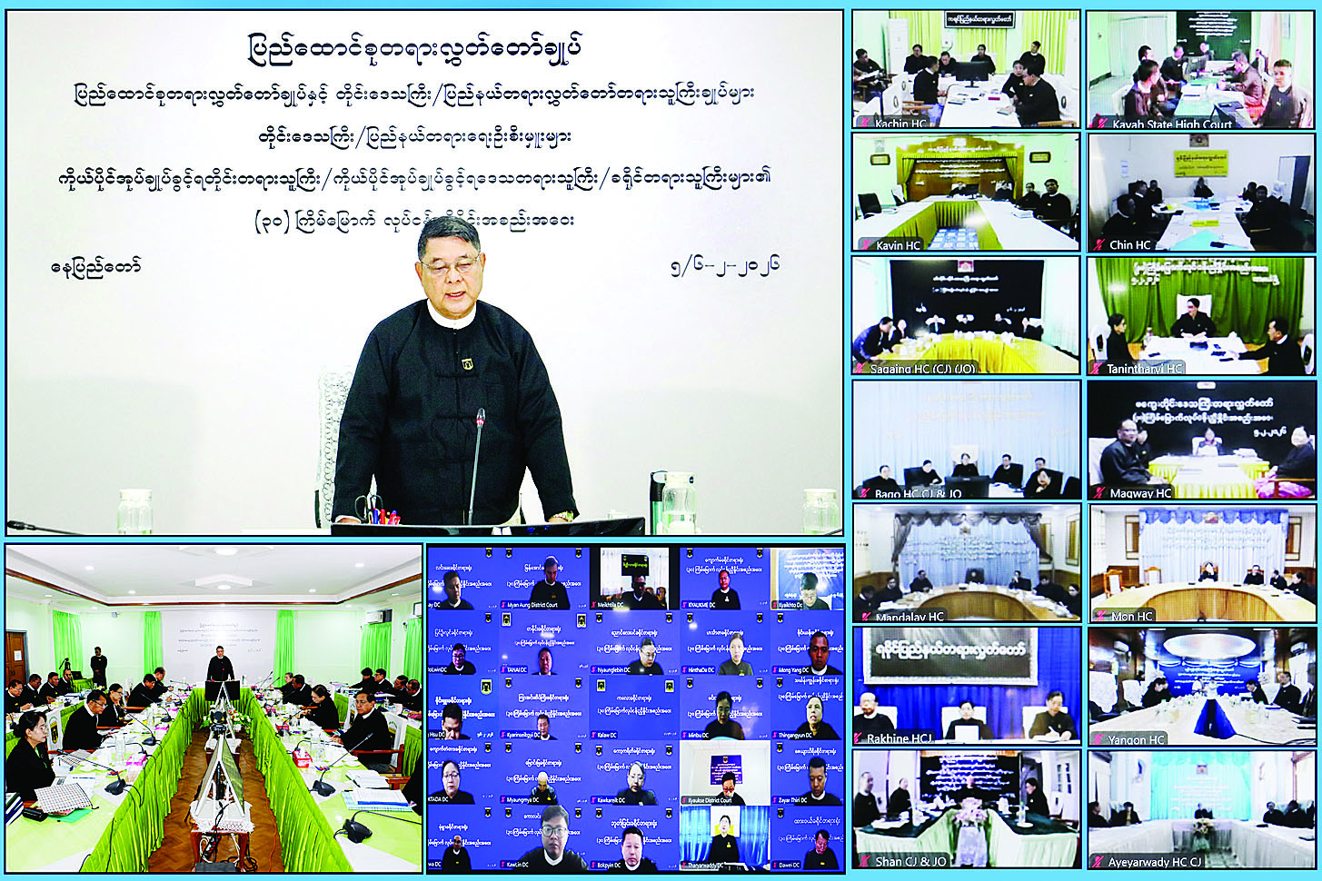 ပြည်ထောင်စုတရားလွှတ်တော်ချုပ်နှင့် တိုင်းဒေသကြီး၊ ပြည်နယ်တရားလွှတ်တော်များ၊ ကိုယ်ပိုင်အုပ်ချုပ်ခွင့်ရ တိုင်းတရားရုံး၊ ကိုယ်ပိုင်အုပ်ချုပ်ခွင့်ရ ဒေသတရားရုံး၊ ခရိုင်တရားရုံးများ၏ အကြိမ် (၃၀)မြောက် ညှိနှိုင်းအစည်းအဝေးကို ယနေ့နံနက် ၉ နာရီတွင် နေပြည်တော်ရှိ ပြည်ထောင်စု တရားလွှတ်တော်ချုပ်၌ ဗီဒီယိုကွန်ဖရင့်စနစ်ဖြင့်ကျင်းပရာ ပြည်ထောင်စုတရား သူကြီးချုပ်ဦးသာဌေး အမှာစကား ပြောကြားသည်။
