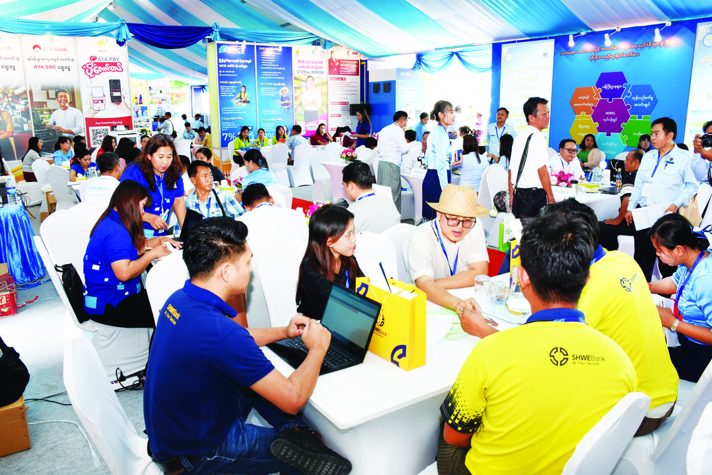 နေပြည်တော်ရင်ပြင်၌ ဖေဖော်ဝါရီ ၈ ရက်မှ ၁၄ ရက်အထိကျင်းပသည့် ပြည်ထောင်စုအဆင့် MSME ထုတ်ကုန်ပြပွဲနှင့် ဈေးရောင်းပွဲတော်၌ ပါဝင်ပြသလျက်ရှိသည့် လုပ်ငန်း/ စီးပွားချိတ်ဆက် (Business Matching) ပြခန်းတွင် တိုင်းဒေသကြီး/ ပြည်နယ်များမှ MSME လုပ်ငန်းရှင်များ၏ ထုတ်ကုန်များကို လုပ်ငန်းစတင် တည်ထောင်သည့်အချိန်မှစ၍ ပြည်တွင်းစျေးကွက်တွင် ရောင်းချခြင်း၊ ပြည်ပစျေးကွက်သို့ တင်ပို့ရောင်းချနိုင်သည်အထိ ချိတ်ဆက်နိုင်မည့် ဝန်ဆောင်မှုများ ဆောင်ရွက်ပေးလျက်ရှိသည်။