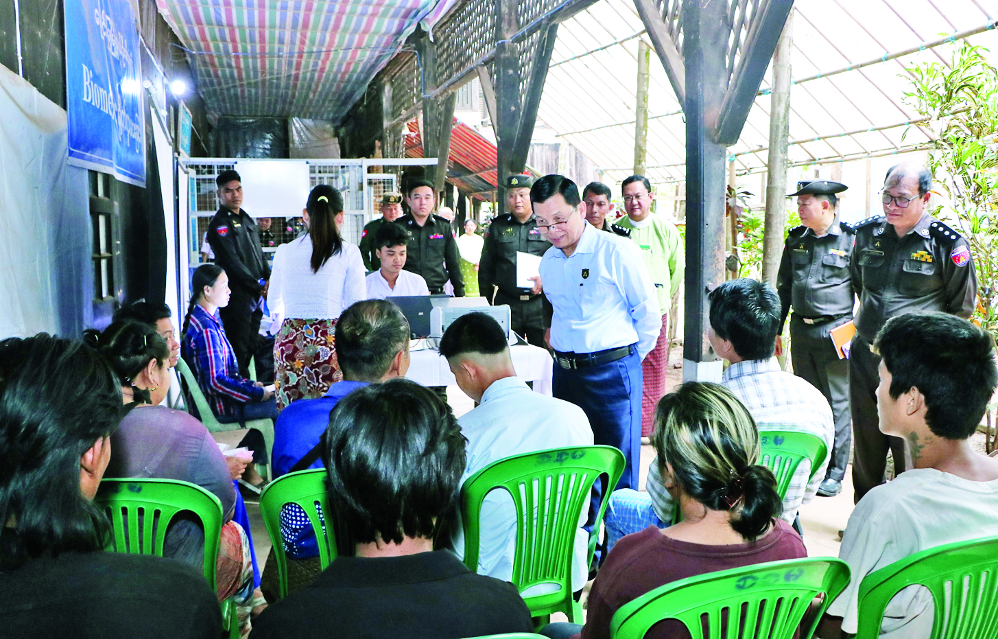 ပြည်ထောင်စုဝန်ကြီး ဦးမြင့်ကြိုင် မြောင်းမြမြို့နယ်ဦးစီးမှူးရုံး၌ ဒေသခံပြည်သူများအား နိုင်ငံသားစိစစ်ရေးဆိုင်ရာလုပ်ငန်းများ ဆောင်ရွက်ပေးနေမှုကြည့်ရှု