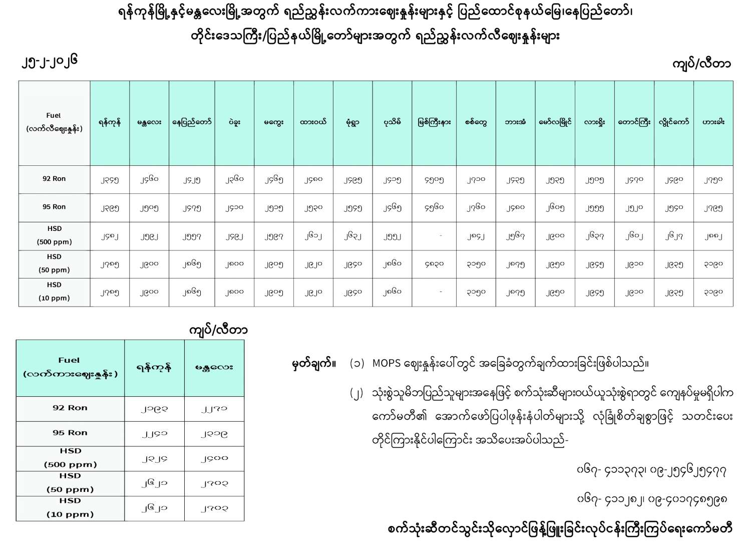 ရန်ကုန်မြို့နှင့် မန္တလေးမြို့အတွက် ရည်ညွှန်းလက်ကားဈေးနှုန်းများနှင့် ပြည်ထောင်စုနယ်မြေ နေပြည်တော်၊ တိုင်းဒေသကြီး/ပြည်နယ် မြို့တော်များအတွက် ရည်ညွှန်းလက်လီဈေးနှုန်းများ 02/25/2026