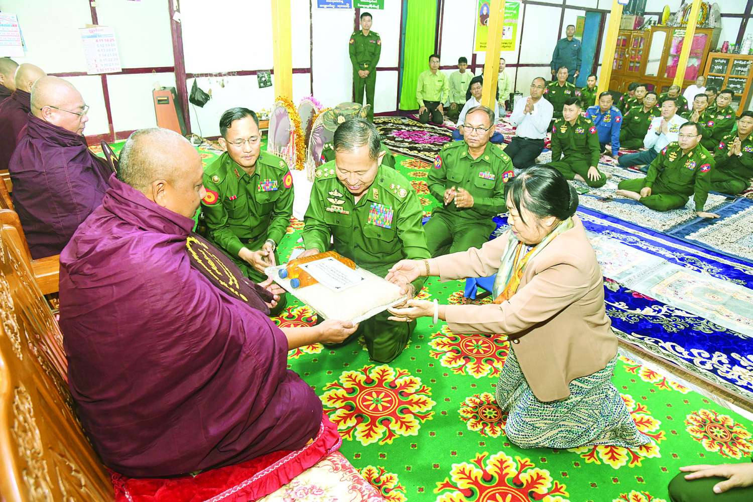 ဦးစွာ နိုင်ငံတော်လုံခြုံရေးနှင့်အေးချမ်းသာယာရေးကော်မရှင် ဒုတိယဥက္ကဋ္ဌ ဒုတိယတပ်မတော်ကာကွယ်ရေးဦးစီးချုပ် ကာကွယ်ရေးဦးစီးချုပ် (ကြည်း) ဒုတိယဗိုလ်ချုပ်မှူးကြီး စိုးဝင်းသည် ဇနီး ဒေါ်သန်းသန်းနွယ်နှင့် အဖွဲ့ဝင်များလိုက်ပါ၍ ရပ်စောက်မြို့ မြို့ကုန်းရပ်ကွက် မြို့မဘုရားကြီး ကျောင်းတိုက် ပဓာနနာယကဆရာတော် မြို့နယ်သံဃနာယကအဖွဲ့ဥက္ကဋ္ဌ မဟာသဒ္ဓမ္မဇောတိကဓဇ ဘဒ္ဒန္တတာရက အမှူးပြုသော သံဃာတော်များအား သွားရောက်ဖူးမြော်ကြည်ညိုပြီး ဆရာတော်ထံမှ ငါးပါးသီလ ခံယူဆောက်တည်၍ ဆရာတော်၊ သံဃာတော်များ ရွတ်ပွားသရဇ္ဈာယ်တော်မူသည့် ပရိတ်တရားတော်များကို နာယူကြည်ညိုကြကာ ဆွမ်းဆန်တော်၊ ဆီ၊ သင်္ကန်း၊ လှူဖွယ်ပစ္စည်းများနှင့် အလှူငွေများ ဆက်ကပ်လှူဒါန်းကြသည်။