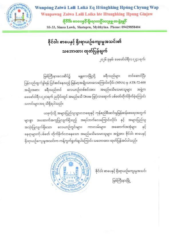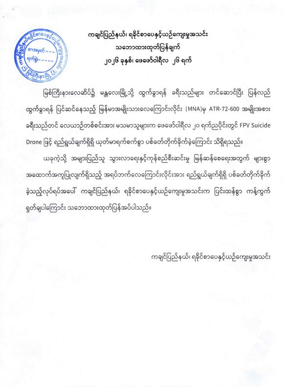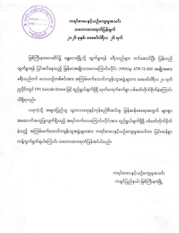 ကချင်ပြည်နယ်၏ အဓိကလေကြောင်းဗဟိုချက်တစ်ခုဖြစ်သော အများပြည်သူသွားလာရေးနှင့် ကုန်စည်စီးဆင်မှုမြန်ဆန်စေရေးအတွက် များစွာအထောက် အကူပြုလျက်ရှိသည့် မြစ်ကြီးနားလေဆိပ်အား KIA အဖွဲ့နှင့် PDF အမည်ခံအကြမ်းဖက် သောင်းကျန်းသူပူးပေါင်းအဖွဲ့များက ဖေဖော်ဝါရီ ၂၀ ရက် ည ၈ နာရီ ၁၂ မိနစ်ခန့်တွင် FPV Suicide Drone များအသုံးပြု၍ ခရီးသွားပြည်သူများ သေဆုံး၊ ထိခိုက်ဒဏ်ရာ ရရှိစေရန် ယုတ်မာပက်စက်သော ရည်ရွယ်ချက်ဖြင့် ပစ်ခတ်တိုက်ခိုက်ခဲ့မှုအပေါ် ဒေသခံပြည်သူများအပြင် တစ်နိုင်ငံလုံးရှိ ပြည်သူလူထုတစ်ရပ်လုံးကပါ လုံးဝလက်ခံနိုင်ခြင်းမရှိဘဲ အဖွဲ့အစည်းအသီးသီးမှလည်း ကန့်ကွက်ရှုတ်ချလျက်ရှိကြရာ ဖေဖော်ဝါရီ ၂၄ ရက်နှင့် ၂၆ ရက်တို့တွင်လည်း ကချင်ပြည်နယ်၊ ရခိုင်စာပေ နှင့်ယဉ်ကျေးမှုအသင်း၊ ကရင်စာပေနှင့်ယဉ်ကျေးမှုအသင်း၊ ဇိုင်ဝါးစာပေနှင့်ရိုးရာ ယဉ်ကျေးမှုအသင်းတို့ကလည်း ပြင်းထန်စွာကန့်ကွက်ရှုတ်ချပါကြောင်း အောက်ပါအတိုင်း သဘောထားထုတ်ပြန်ချက်များ အသီးသီးထုတ်ပြန်ခဲ့ကြကြောင်း သတင်းရရှိသည်။