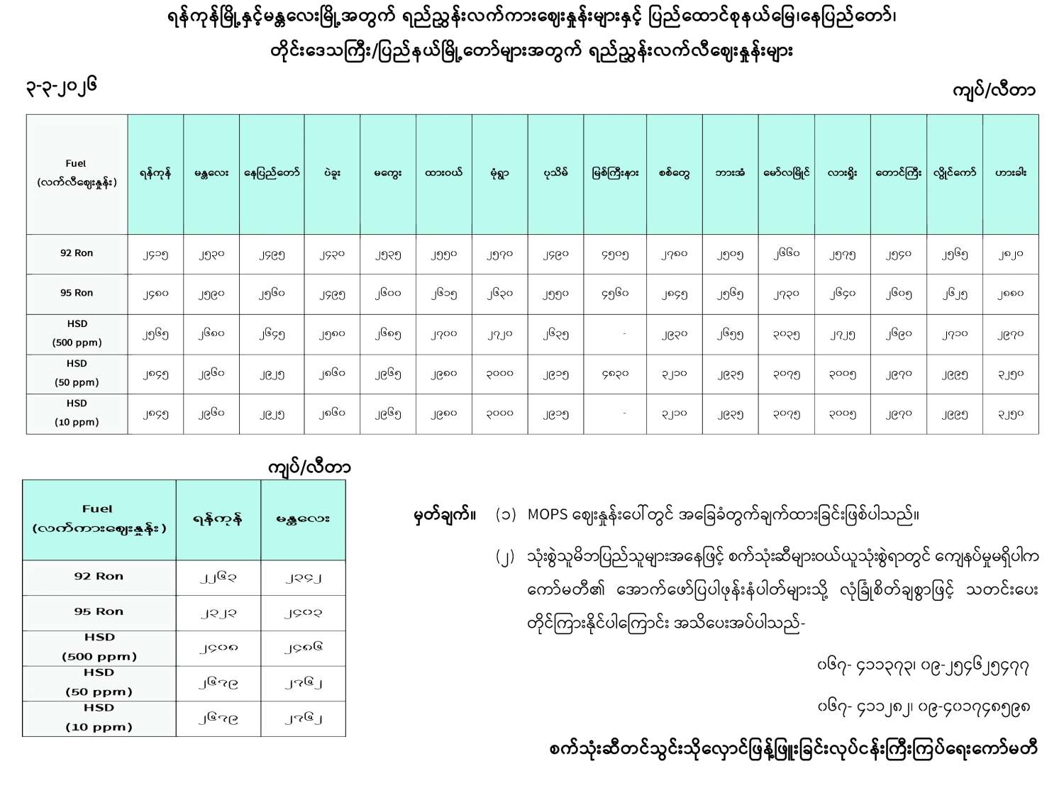 ရန်ကုန်မြို့နှင့် မန္တလေးမြို့အတွက် ရည်ညွှန်းလက်ကားဈေးနှုန်းများနှင့် ပြည်ထောင်စုနယ်မြေ နေပြည်တော်၊ တိုင်းဒေသကြီး/ပြည်နယ် မြို့တော်များအတွက် ရည်ညွှန်းလက်လီဈေးနှုန်းများ 03/03/2026