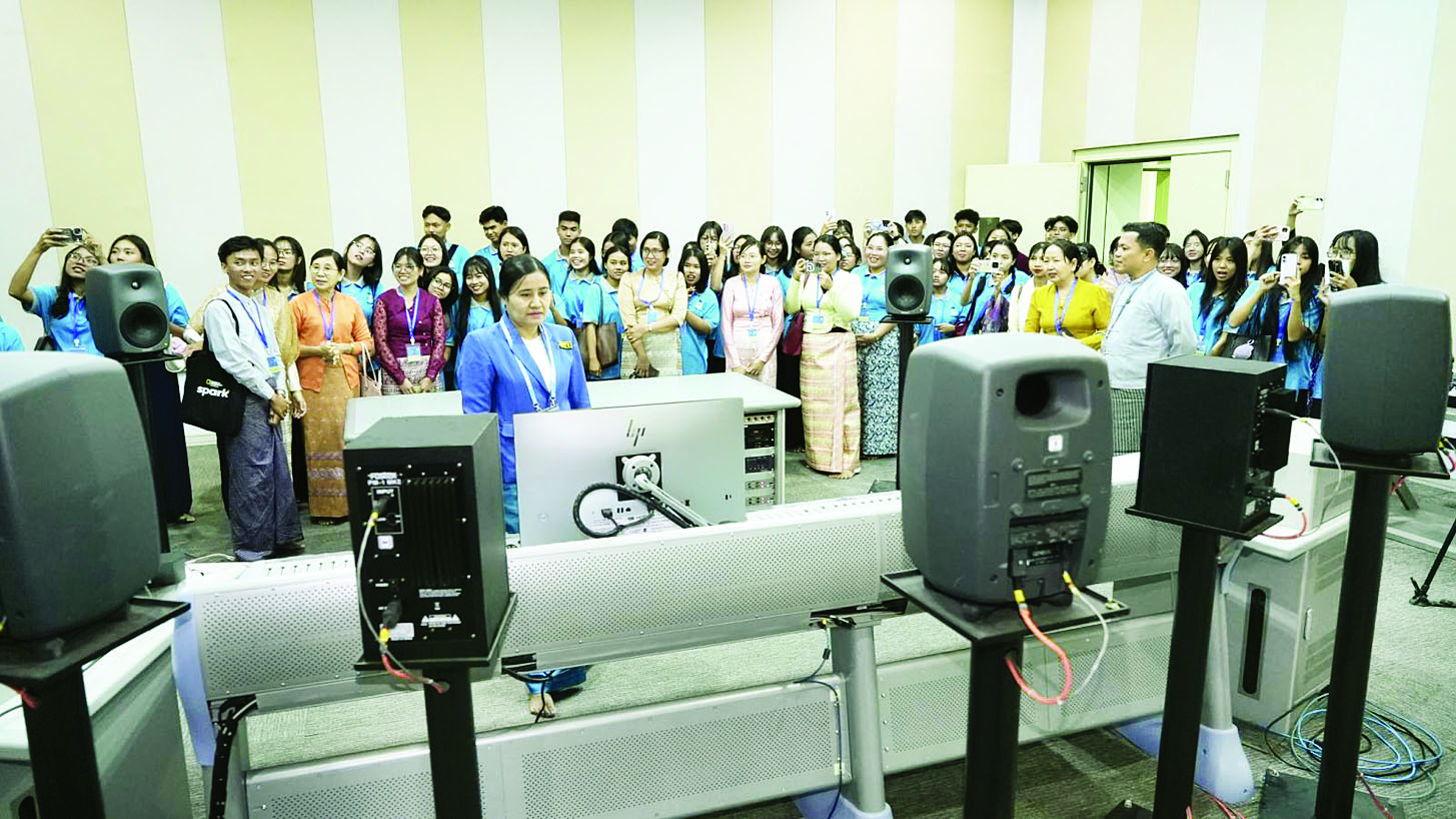 ကျောင်းသား ကျောင်းသူများသည် အဖွဲ့နှစ်ဖွဲ့ခွဲ၍ မြန်မာ့အသံနှင့်ရုပ်မြင်သံကြား ပင်မအဆောက် အဦရှိ Audio Mastering Studio၊ News Channel Studio နှင့် Radio Recording Studio တွင် အသံသွင်းမှုကို လေ့လာကြသည်။