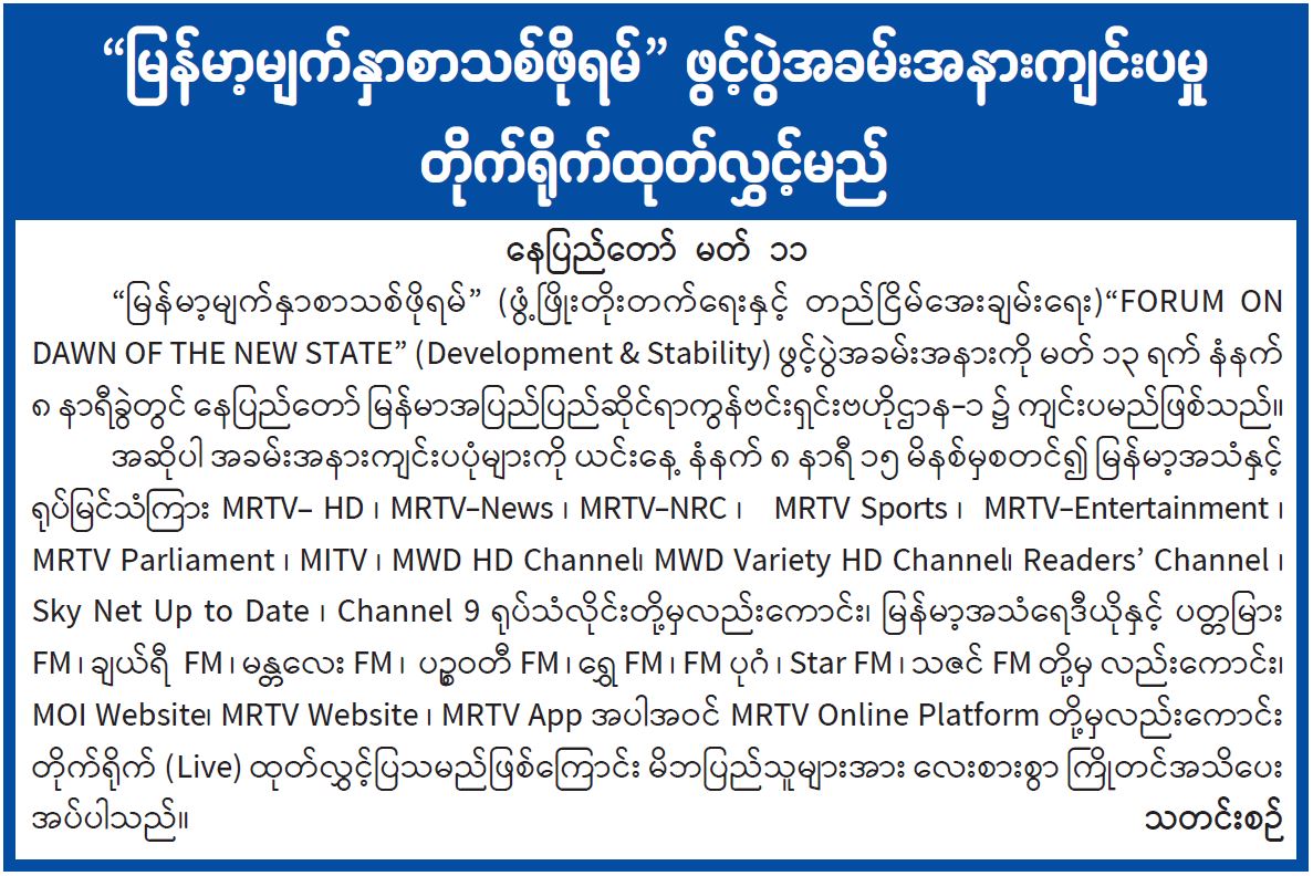 “မြန်မာ့မျက်နှာစာသစ်ဖိုရမ်” ဖွင့်ပွဲအခမ်းအနားကျင်းပမှု တိုက်ရိုက်ထုတ်လွှင့်မည်