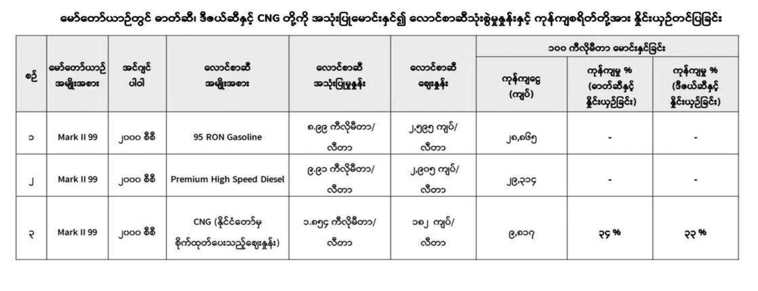 CNG သုံးယာဉ်များနှင့် စပ်လျဉ်း၍ အများပြည်သူအနေဖြင့် ကျေနပ်မှုမရှိပါက အောက်ပါဖုန်းနံပါတ်များသို့ တိုင်ကြားနိုင်ပါကြောင်း သတင်းရရှိသည်။