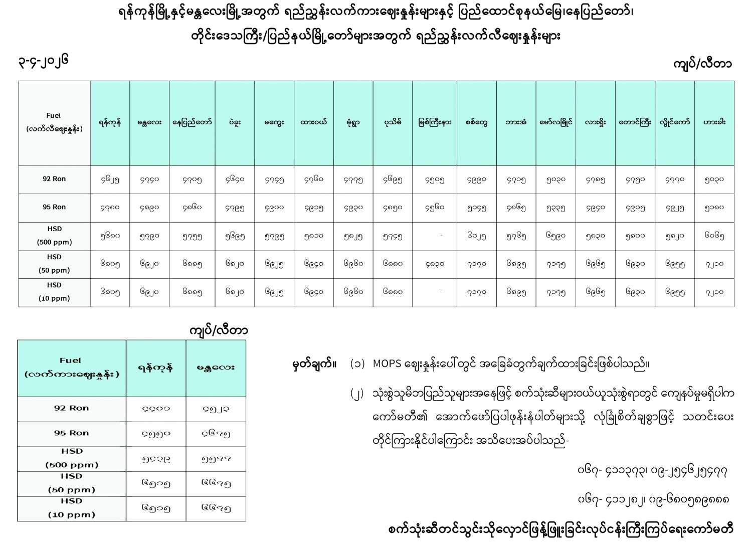ရန်ကုန်မြို့နှင့် မန္တလေးမြို့အတွက် ရည်ညွှန်းလက်ကားဈေးနှုန်းများနှင့် ပြည်ထောင်စုနယ်မြေ နေပြည်တော်၊ တိုင်းဒေသကြီး/ပြည်နယ် မြို့တော်များအတွက် ရည်ညွှန်းလက်လီဈေးနှုန်းများ 04/03/2026