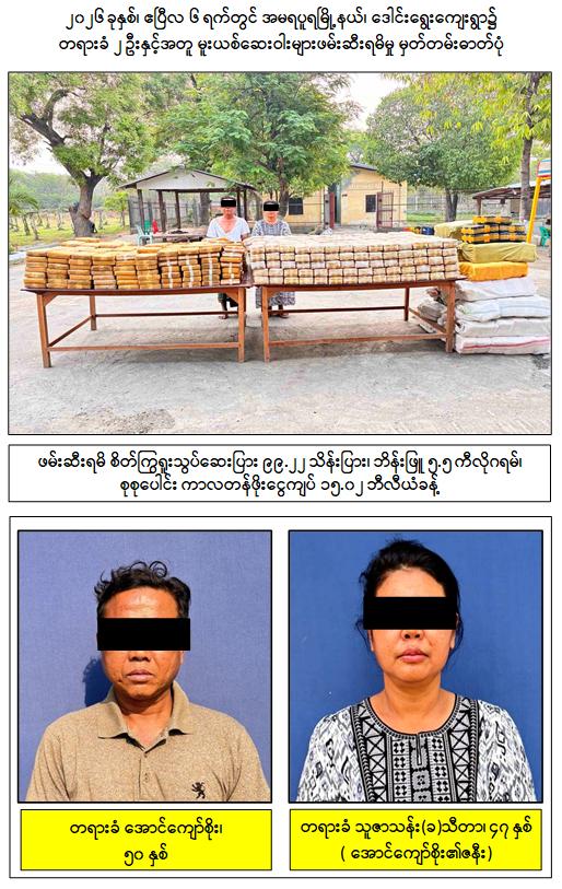 ထိုသို့ ဆောင်ရွက်လျက်ရှိရာ မန္တလေးတိုင်းဒေသကြီး၊ မန္တလေးမြို့၊ ပြည်ကြီးတံခွန်မြို့နယ်အတွင်း မူးယစ်ဆေးဝါးရောင်းချနေသူများရောက်ရှိနေကြောင်း တာဝန်သိပြည်သူတစ်ဦး၏ သတင်းပေးချက်အရ လုံခြုံရေးတပ်ဖွဲ့ဝင်များက ဖမ်းဆီးရမိရေးဆောင်ရွက်ခဲ့ရာ ၂၀၂၆ ခုနှစ်၊ ဧပြီလ ၆ ရက် နံနက် ၈နာရီ ၃၀မိနစ်ခန့်တွင် ပြည်ကြီးတံခွန်မြို့နယ်၊ (ဆ) ရပ်ကွက်၊ ၅၄(ဘီ)လမ်း၊ ၁၂၈ x ၁၂၉ လမ်းကြား၌ မူးယစ်ဆေးဝါးများ ဖြန့်ဖြူးရောင်းချသူများဖြစ်သည့် အောင်ကျော်စိုးနှင့် ဇနီးဖြစ်သူ သူဇာသန်း (ခ) သီတာတို့အား ဖမ်းဆီးရမိခဲ့ပြီး အမရပူရမြို့နယ်၊ ဒေါင်းရွေးကျေးရွာရှိ ၎င်းတို့၏နေအိမ်အား သွားရောက်ရှာဖွေခဲ့ရာ စိတ်ကြွရူးသွပ်ဆေးပြား ၉၉.၂၂ သိန်းပြား(ခန့်မှန်းတန်ဖိုး ၁ ပြားလျှင် ၁၅၀၀ ကျပ်)၊ ဘိန်းဖြူ ၅.၅ ကီလို ဂရမ်(ခန့်မှန်းတန်ဖိုး ၁ ကီလိုဂရမ်လျှင် ငွေကျပ်သိန်း ၂၅၀ ကျပ်)၊ စုစုပေါင်းခန့်မှန်းတန်ဖိုးငွေကျပ် ၁၅ ဒသမ ၀၂ ဘီလီယံခန့်ကို တွေ့ရှိသိမ်းဆည်းရမိခဲ့သည်။