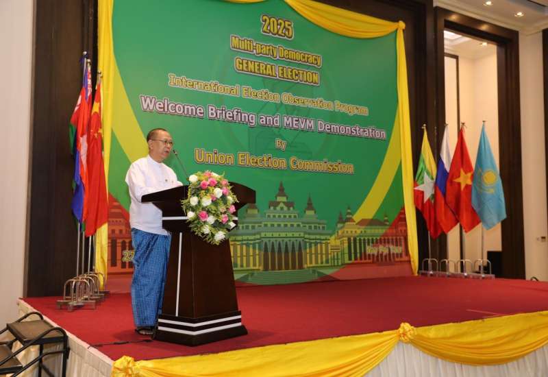 ၂၀၂၅ ခုနှစ် ဒီဇင်ဘာလ ၂၈ ရက်နေ့တွင် စတင်ကျင်းပပြုလုပ်မည့် ပါတီစုံဒီမိုကရေစီအထွေထွေရွေးကောက်ပွဲသို့ လာရောက်လေ့လာကြသည့် နိုင်ငံတကာရွေးကောက်ပွဲစောင့်ကြည့်လေ့လာသူများအား ကြိုဆိုနှုတ်ခွန်းဆက်စကား ပြောကြားခြင်းနှင့် ရွေးကောက်ပွဲဆိုင်ရာ ရှင်းလင်းဆွေးနွေးခြင်းအခမ်းအနားကို ယနေ့မွန်းလွဲ ၁၃:၀၀ နာရီတွင် နေပြည်တော်ရှိ Jasmine Nay Pyi Taw ဟိုတယ်၌ ကျင်းပပြုလုပ်ရာ ပြည်ထောင်စုရွေးကောက်ပွဲကော်မရှင်ဥက္ကဋ္ဌ ဦးသန်းစိုးတက်ရောက်၍ အမှာစကားပြောကြားသည်။