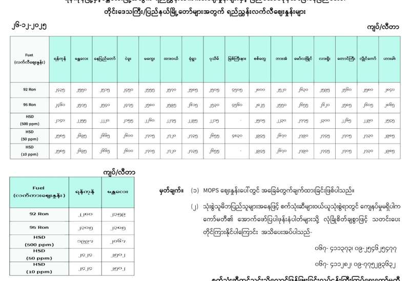 ရန်ကုန်မြို့နှင့် မန္တလေးမြို့အတွက် ရည်ညွှန်းလက်ကားဈေးနှုန်းများနှင့် ပြည်ထောင်စုနယ်မြေ နေပြည်တော်၊ တိုင်းဒေသကြီး/ ပြည်နယ် မြို့တော်များအတွက် ရည်ညွှန်းလက်လီဈေးနှုန်းများ