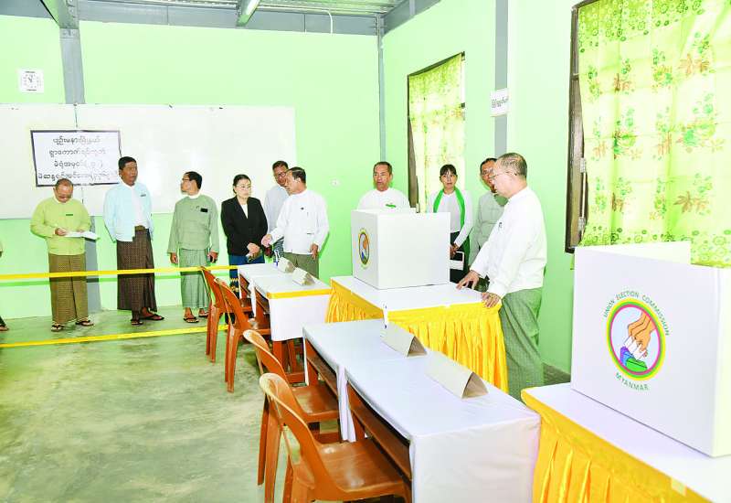 ပြည်ထောင်စုရွေးကောက်ပွဲကော်မရှင်ဥက္ကဋ္ဌ ဦးသန်းစိုးသည် ပြည်ထောင်စုရွေးကောက်ပွဲကော်မရှင်အဖွဲ့ဝင် ပြည်ထောင်စုနယ်မြေ(တာဝန်ခံ) ဦးမျိုးလှိုင်၊ ပြည်ထောင်စုရွေးကောက်ပွဲကော်မရှင်ရုံးမှ တာဝန်ရှိသူများ၊ ပြည်ထောင်စုနယ်မြေ ရွေးကောက်ပွဲကော်မရှင်အဖွဲ့ခွဲဥက္ကဋ္ဌနှင့် အဖွဲ့ဝင်များ၊ တာဝန်ရှိသူများနှင့်အတူ ယနေ့နံနက်ပိုင်းတွင် ၂၀၂၅ ခုနှစ် ပါတီစုံဒီမိုကရေစီအထွေထွေရွေးကောက်ပွဲ အောင်မြင်စွာကျင်းပနိုင်ရေးအတွက် ပြည်ထောင်စုနယ်မြေအတွင်း မဲရုံများဖွင့်လှစ်ဆောင်ရွက်ထားရှိမှုအခြေအနေကို လှည့်လည်ကြည့်ရှုစစ်ဆေးသည်။