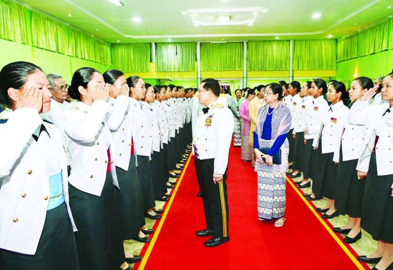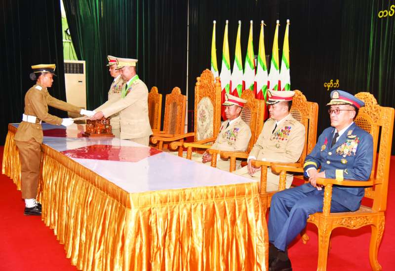 တပ်မတော်(ကြည်း)ဗိုလ်သင်တန်းကျောင်း(မှော်ဘီ)၊ ဘွဲ့ရအမျိုးသမီး ဗိုလ်လောင်းသင်တန်းအမှတ်စဉ်(၁၂) သင်တန်းဆင်းဂုဏ်ပြုညစာစားပွဲအခမ်းအနားကို ယနေ့ညနေပိုင်းတွင် ရန်ကုန်မြို့၊ တပ်မတော်(ကြည်း) ဗိုလ်သင်တန်းကျောင်း(မှော်ဘီ)ရှိ ပြည်ထောင်စုခန်းမ၌ကျင်းပရာ နိုင်ငံတော်လုံခြုံရေးနှင့် အေးချမ်းသာယာရေးကော်မရှင်ဥက္ကဋ္ဌ တပ်မတော်ကာကွယ်ရေးဦးစီးချုပ် ဗိုလ်ချုပ်မှူးကြီးမင်းအောင်လှိုင် တက်ရောက်ချီးမြှင့်သည်။