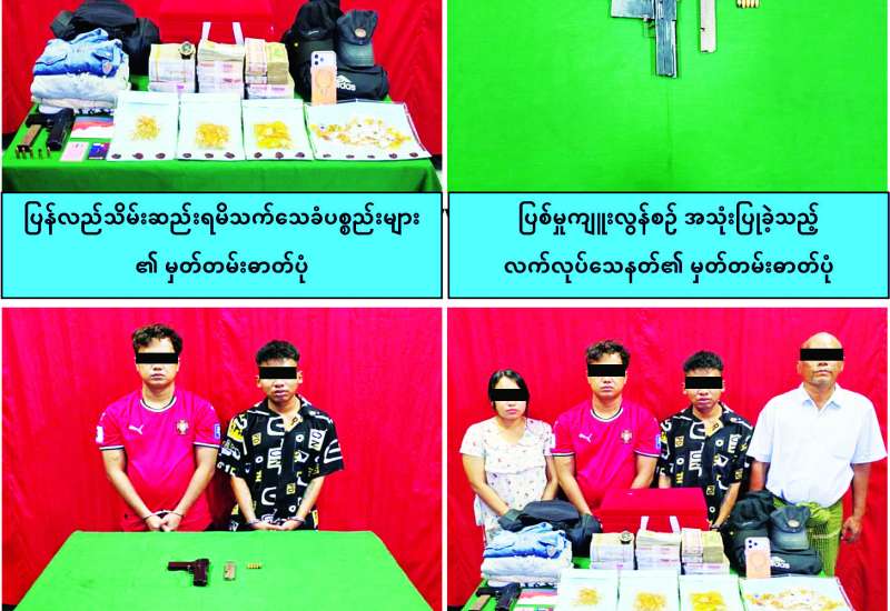 ရန်ကုန်တိုင်းဒေသကြီး လသာမြို့နယ် အမှတ် (၃) ရပ်ကွက် မဟာဗန္ဓုလလမ်းရှိ “ရွှေဇင်” အာမခံရွှေဆိုင်မှ ရွှေထည်ပစ္စည်းများနှင့် ငွေကျပ်သိန်း ၁၀၃၀ ကို ဒီဇင်ဘာ ၅ ရက်က သေနတ်ဖြင့်ခြိမ်းခြောက်၍ လုယက်ယူဆောင်ခဲ့သူများနှင့် ပူးပေါင်းပါဝင်သူတို့အား သက်သေခံပစ္စည်းများနှင့်အတူ ဖော်ထုတ်ဖမ်းဆီးရမိခဲ့ကြောင်း သိရသည်။