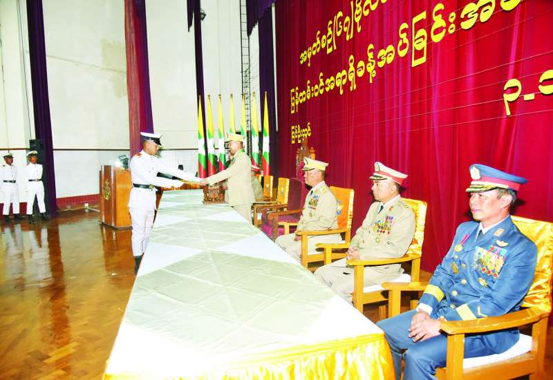 စစ်တက္ကသိုလ် ဗိုလ်လောင်းသင်တန်းအမှတ်စဉ် (၆၇) သင်တန်းဆင်းဂုဏ်ပြုညစာစားပွဲအခမ်းအနားကို ယနေ့ညနေပိုင်းတွင် ပြင်ဦးလွင်မြို့၊ စစ်တက္ကသိုလ်၊ အနော်ရထာတပ်ရင်း ဗိုလ်လောင်းစားရိပ်သာ၌ ကျင်းပပြုလုပ်ရာ နိုင်ငံတော်လုံခြုံရေးနှင့်အေးချမ်းသာယာရေးကော်မရှင်ဥက္ကဋ္ဌ တပ်မတော်ကာကွယ်ရေးဦးစီးချုပ် ဗိုလ်ချုပ်မှူးကြီး မင်းအောင်လှိုင် တက်ရောက်ချီးမြှင့်သည်။