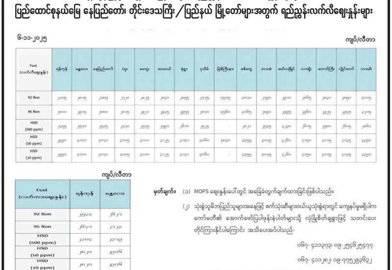 ရန်ကုန်မြို့နှင့် မန္တလေးမြို့အတွက် ရည်ညွှန်းလက်ကားဈေးနှုန်းများနှင့် ပြည်ထောင်စုနယ်မြေ နေပြည်တော်၊ တိုင်းဒေသကြီး/ပြည်နယ် မြို့တော်များအတွက် ရည်ညွှန်းလက်လီဈေးနှုန်းများ