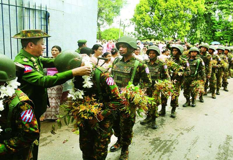 ရှေ့တန်းစစ်မျက်နှာများတွင် ရွပ်ရွပ်ချွံချွံတိုက်ပွဲဝင်ပြီး အောင်ပွဲအလီလီရယူနိုင်ခဲ့သော အောင်ပွဲရရှေ့တန်းပြန်တပ်မတော်သားများအား ဂုဏ်ပြုကြိုဆိုခြင်းကို ယမန်နေ့ညနေပိုင်းတွင် မိုင်းပွန်မြို့ရှိ နယ်မြေခံတပ်၌ပြုလုပ်ရာ အရှေ့အလယ်ပိုင်းတိုင်းစစ်ဌာနချုပ်တိုင်းမှူး ဗိုလ်ချုပ် စိုးမြတ်ထွဋ်နှင့်အဖွဲ့ဝင်များ၊ အရာရှိ၊ စစ်သည်၊ မိသားစုဝင်များ၊ ဌာနဆိုင်ရာ တာဝန်ရှိသူများ၊ ဒေသခံတိုင်းရင်းသား ပြည်သူများ၊ ဆရာ/ဆရာမများ တက်ရောက်ကြသည်။