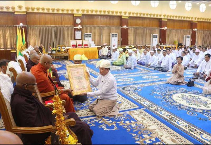 ဗုဒ္ဓဘာသာကလျာဏယုဝအသင်းကြီး (YMBA) (ဗဟို) မှ ရခိုင်ပြည်နယ်အတွင်းရှိ ဆရာတော်ကြီး ၄ ပါးနှင့် လူပုဂ္ဂိုလ် ၃ ဦးတို့အား မင်္ဂလဘွဲ့တံဆိပ်တော်များ ဆက်ကပ်လှူဒါန်းချီးမြှင့်ပွဲမင်္ဂလာကို ယနေ့မွန်းလွဲပိုင်းတွင် ရခိုင်ပြည်နယ်၊ စစ်တွေမြို့ရှိ ပြည်နယ်အစိုးရအဖွဲ့ရုံးခန်းမ၌ ပြုလုပ်ရာ စစ်တွေမြို့၊ နန္ဒာရာမပရိယတ္တိစာသင်တိုက် ပဓာနနာယကဆရာတော် အဂ္ဂမဟာမင်္ဂလဓမ္မဇောတိကဓဇ၊ အဂ္ဂမဟာပဏ္ဍိတ၊ အဘိဓဇမဟာရဋ္ဌဂုရု ဘဒ္ဒန္တနန္ဒာသီရိ အမှူးပြုသော သံဃာတော်များ ကြွရောက်တော်မူကြပြီး ပြည်နယ်ဝန်ကြီးချုပ် ဦးထိန်လင်း၊ အနောက်ပိုင်းတိုင်းစစ်ဌာနချုပ် တိုင်းမှူး ဗိုလ်ချုပ်ကျော်စွာဦးနှင့် အဖွဲ့ဝင်များ၊ ဗုဒ္ဓဘာသာကလျာဏယုဝအသင်းကြီး (YMBA) (ဗဟို) ဥက္ကဋ္ဌနှင့် အဖွဲ့ဝင်များ၊ ဌာနဆိုင်ရာ တာဝန်ရှိသူများနှင့် မြို့မိ/ မြို့ဖများ တက်ရောက်ကြသည်။