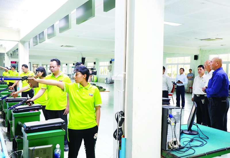 မြန်မာနိုင်ငံအိုလံပစ်ကော်မတီဥက္ကဋ္ဌ အားကစားနှင့်လူငယ်ရေးရာဝန်ကြီးဌာနနှင့် ဟိုတယ်နှင့်ခရီးသွားလာရေးဝန်ကြီးဌာန ပြည်ထောင်စုဝန်ကြီး Jeng Phang နော်တောင်သည် အားကစားနှင့်လူငယ်ရေးရာဝန်ကြီးဌာန ဒုတိယဝန်ကြီး ဦးထိန်လင်း၊ အားကစားနှင့်ကာယပညာဦးစီးဌာန ညွှန်ကြားရေးမှူးချုပ်နှင့်အတူ ယမန်နေ့မွန်းလွဲပိုင်းတွင် ရန်ကုန်မြို့၌ စခန်းဝင်လေ့ကျင့်လျက်ရှိသည့် သေနတ်ပစ်နှင့် မြားပစ်အားကစားအဖွဲ့များ၏ လေ့ကျင့်နေမှုများကို လိုက်လံကြည့်ရှုစစ်ဆေးသည်။