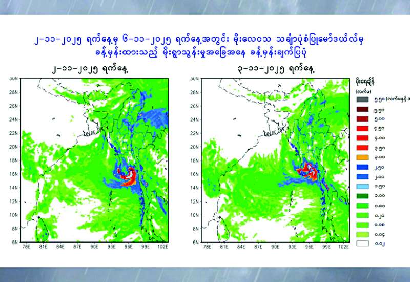 ယနေ့မွန်းလွဲ ၃ နာရီခွဲ တိုင်းထွာချက်များအရ အရှေ့ဘက်မှ ရွေ့လျားလာသော လေပွေလှိုင်းများ၏အရှိန်ကြောင့်လည်းကောင်း၊ ကပ္ပလီပင်လယ်ပြင်မြောက်ပိုင်းနှင့် ယင်းနှင့်ဆက်စပ်လျက်ရှိသော ဘင်္ဂလားပင်လယ်အော်အရှေ့အလယ်ပိုင်းတို့တွင် ဖြစ်ပေါ်နေသော လေဖိအားနည်းရပ်ဝန်း၏အရှိန်ကြောင့်လည်းကောင်း နိုဝင်ဘာ ၂ ရက် မှ ၆ ရက်အတွင်း နေပြည်တော်၊ ရန်ကုန်တိုင်းဒေသကြီး၊ မန္တလေးတိုင်းဒေသကြီး၊ ပဲခူးတိုင်းဒေသကြီး၊ မကွေးတိုင်းဒေသကြီး၊ စစ်ကိုင်းတိုင်းဒေသကြီး၊ ဧရာဝတီတိုင်းဒေသကြီး၊ တနင်္သာရီတိုင်းဒေသကြီး၊ ကချင်ပြည်နယ်၊ ကယားပြည်နယ်၊ ကရင်ပြည်နယ်၊ ချင်းပြည်နယ်၊ မွန်ပြည်နယ်၊ ရခိုင်ပြည်နယ်နှင့် ရှမ်းပြည်နယ်တို့တွင် နေရာစိပ်စိပ်မှ နေရာအနှံ့အပြားမိုးထစ်ချုန်းရွာပြီး အချို့ဒေသများတွင် ဒေသအလိုက်နှင့် နေရာကွက်၍ မိုးကြီးခြင်းများ ဖြစ်ပေါ်နိုင်သည်။