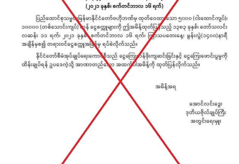 ပြည်ထောင်စုသမ္မတမြန်မာနိုင်ငံတော်ဗဟိုဘဏ်မှ ထုတ်ထားသည့် ၅၀၀၀ ကျပ်တန်၊ ၁၀၀၀၀ ကျပ်တန် ငွေစက္ကူများကို တရားဝင်ငွေစက္ကူအဖြစ်မှ ရပ်စဲလိုက်ကြောင်း အမိန့်စာ အတုများ လူမှုကွန်ရက်စာမျက်နှာပေါ်တွင် ပျံ့နှံ့လျက်ရှိသည်။