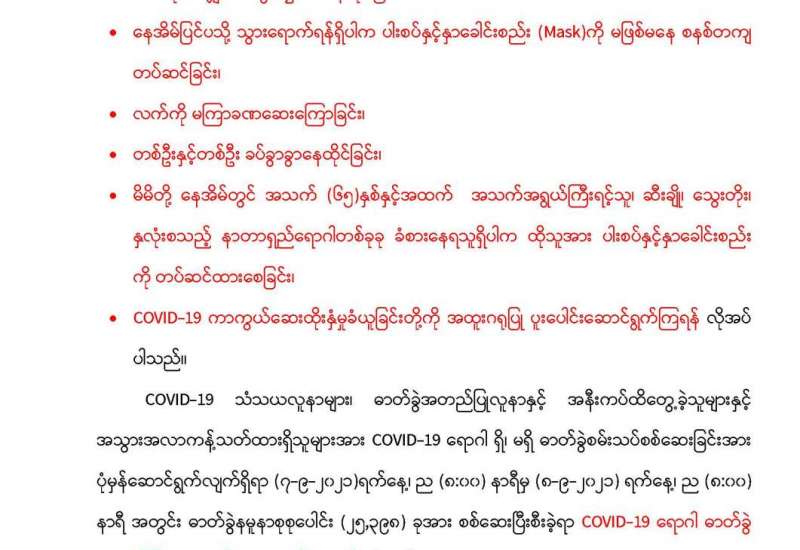 နိုင်ငံတော်စီမံအုပ်ချုပ်ရေးကောင်စီအနေဖြင့် မြန်မာနိုင်ငံအတွင်း ကိုဗစ်-၁၉ ရောဂါကာကွယ် ဟန့်တားနိုင်ရေးအတွက် ကာကွယ်ဆေးများ ရရှိရေးနှင့် ရောက်ရှိလာသော ကာကွယ် ဆေးများအား ပြည်သူလူထုထံအမြန်ဆုံး ရောက်ရှိထိုးနှံနိုင်ရေး အားသွန်ခွန်စိုက်ဆောင်ရွက်လျက်ရှိရာ NUG ၊ PDF အကြမ်းဖက်လုပ်ရပ်များနှင့် ၎င်းတို့မှ အခကြေးငွေပေးပြီးခိုင်းစေခံရသူများက အဆိုပါကာ ကွယ်ဆေး ထိုးနှံနေသူများကို နှောက်ယှက်တိုက်ခိုက်ခြင်း၊ မိုင်းထောင်ဗုံးခွဲခြင်းများ နေရာအနှံ့ဆောင်ရွက်လျက် ရှိသည်။