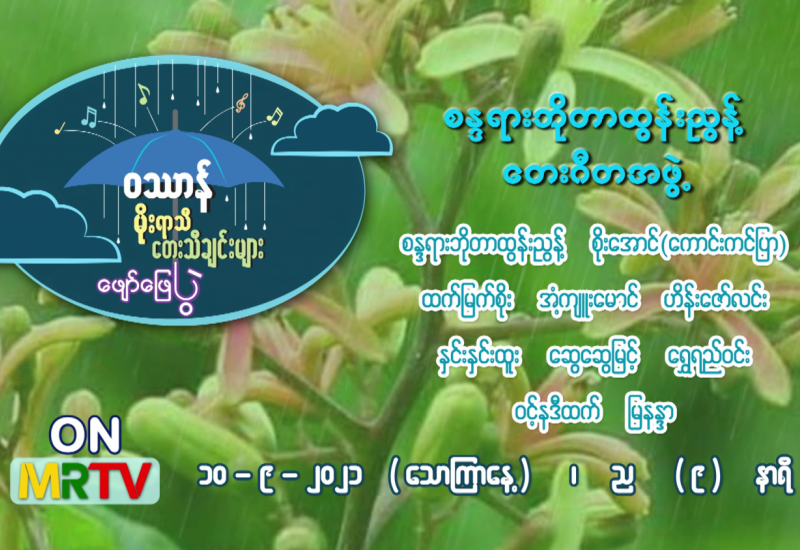 ဝဿာန်မိုးရာသီ တေးသီချင်းများ ဖျော်ဖြေပွဲ၏ ပွဲစဉ်(၁၅)ကို စက်တင်ဘာ(၁၀)ရက်၊ သောကြာနေ့ ည(၈)နာရီသတင်းအပြီးတွင် မြန်မာ့အသံနှင့် ရုပ်မြင်သံကြား၌ ထုတ်လွှင့် ပြသမည် ဖြစ်သည်။