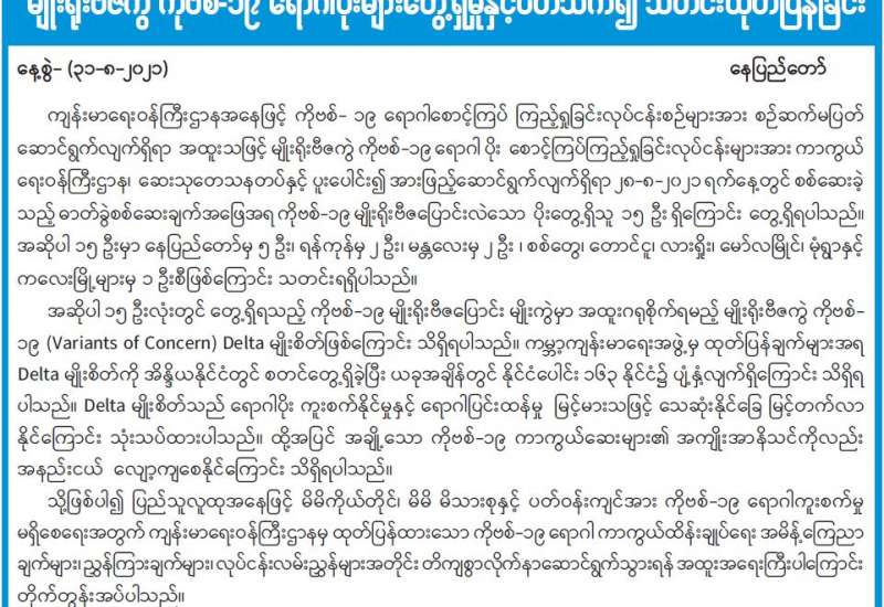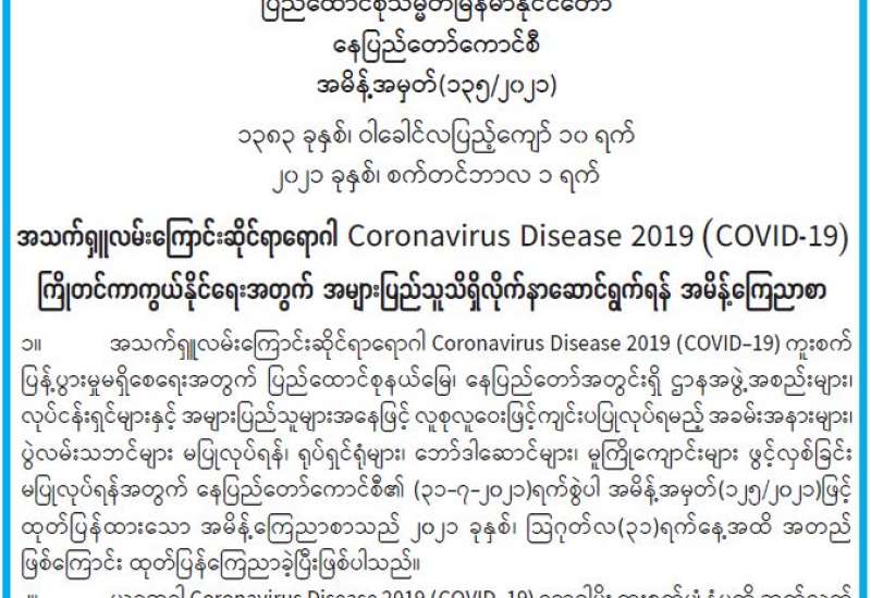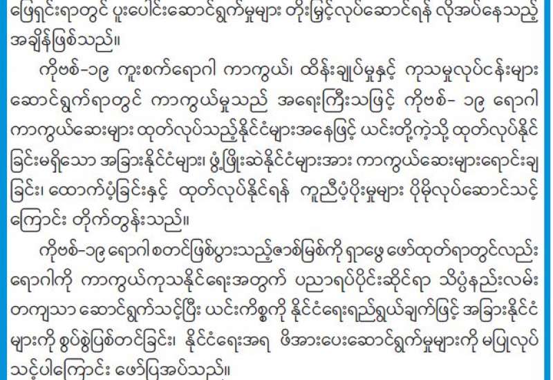 ကျန်းမာရေးဝန်ကြီးဌာနအနေဖြင့် နိုင်ငံအတွင်း ကူးစက်ဖြစ်ပွားနေသော COVID-19 ရောဂါကာကွယ်၊ ကုသ၊ ထိန်းချုပ်ရေးလုပ်ငန်းများကို အရှိန်အဟုန်မြှင့်ဆောင်ရွက်လျက်ရှိရာ ရောဂါထိန်းချုပ်ရေးလုပ်ငန်းများ အောင်မြင်နိုင်ရေးအတွက် ပြည်သူလူထုအနေဖြင့် -