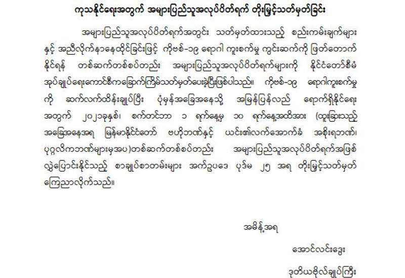 ကိုဗစ်-၁၉ ရောဂါ ကူးစက်ပြန့်ပွားမှုကို ပိုမိုထိရောက်စွာ ကာကွယ်၊ ထိန်းချုပ်၊ ကုသနိုင်ရေးအတွက် အများပြည်သူ အလုပ်ပိတ်ရက် တိုးမြှင့်သတ်မှတ်ခြင်း