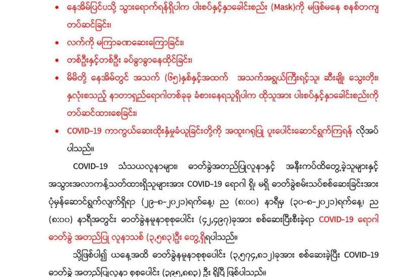 မြန်မာ့အသံနှင့် ရုပ်မြင်သံကြားမှ ဩဂုတ် ၂၈ ရက် ည ၈နာရီ သတင်းအပြီးတွင် ထုတ်လွှင့်ပြသခဲ့သည့် ကိုဗစ် - ၁၉ ရောဂါ ကာကွယ်ထိန်းချုပ်ရေးဆိုင်ရာ ဆောင်ရွက်ချက်များအကြောင်း သိကောင်းစရာ အစီအစဉ်ကို ပြည်သူများသိရှိနိုင်ရန်အတွက် ပြန်လည်ဖော်ပြလိုက်ပါသည်။