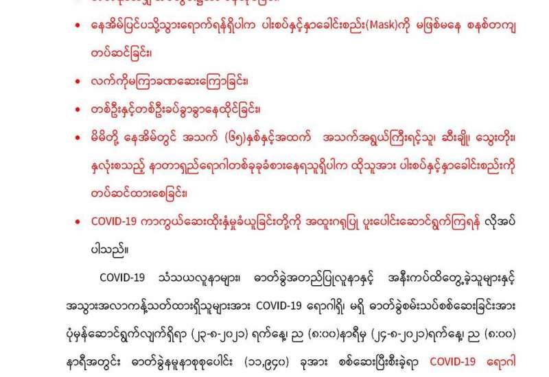 ကျန်းမာရေးဝန်ကြီးဌာနအနေဖြင့် နိုင်ငံအတွင်း ကူးစက်ဖြစ်ပွားနေသော COVID-19 ရောဂါကာကွယ်၊ ကုသ၊ ထိန်းချုပ်ရေးလုပ်ငန်းများကို အရှိန်အဟုန်မြှင့်ဆောင်ရွက်လျက်ရှိရာ ရောဂါထိန်းချုပ်ရေးလုပ်ငန်းများ အောင်မြင်နိုင်ရေးအတွက် ပြည်သူလူထုအနေဖြင့် -
