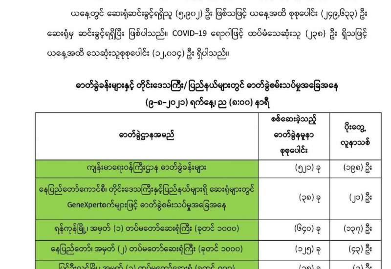 (၉-၈-၂၀၂၁) ရက်နေ့၊ ည (၈:၀၀) နာရီမှ (၁၀-၈-၂၀၂၁) ရက်နေ့၊ ည (၈:၀၀) နာရီအတွင်း ဓာတ်ခွဲနမူနာစုစုပေါင်း (၁၄,၄၅၇) ခုအား စစ်ဆေးပြီးစီးခဲ့ရာ COVID-19 ရောဂါ ဓာတ်ခွဲ အတည်ပြု လူနာသစ် (၄,၄၃၄) ဦး တွေ့ရှိရပါသည်။ သို့ဖြစ်ပါ၍ ယနေ့အထိ ဓာတ်ခွဲနမူနာ စုစုပေါင်း (၃,၂၈၄,၂၃၇) ခု အား စစ်ဆေးခဲ့ပြီး COVID-19 ဓာတ်ခွဲအတည်ပြုလူနာ စုစုပေါင်း (၃၃၇,၅၆၁) ဦး ရှိပြီဖြစ်ပါသည်။