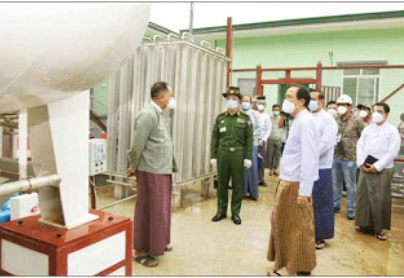 နေပြည်တော် ပုဗ္ဗသီရိမြို့နယ် တပင်ရွှေထီးရပ်ကွက်ရှိ နေပြည်တော် ပြည်သူ့ ဆေးရုံကြီး ခုတင် (၃၀၀) ဝန်းအတွင်း တည်ဆောက်ထားသည့် ကျန်းမာရေး ဝန်ကြီးဌာန၊ ကုသရေးဦးစီးဌာန အောက်ဆီဂျင် ထုတ်လုပ်သည့်စက်ရုံ (Liquid Oxygen Plant) (နေပြည်တော်) ကို ယနေ့နံနက်ပိုင်းတွင် စတင်ဖွင့်လှစ်ရာ ကျန်းမာရေးဝန်ကြီးဌာန ပြည်ထောင်စုဝန်ကြီး ဒေါက်တာသက်ခိုင်ဝင်း၊ ဆောက်လုပ်ရေး ဝန်ကြီးဌာန ပြည်ထောင်စုဝန်ကြီး ဦးရွှေလေး၊ နေပြည်တော်တိုင်းစစ်ဌာနချုပ် တိုင်းမှူး ဗိုလ်ချုပ်ဇော်မျိုးတင်၊ နေပြည်တော်ကောင်စီဝင် ဗိုလ်မှူးကြီးမင်းနောင်နှင့် တာဝန်ရှိသူများသည် စက်ရုံ အတွင်း အောက်ဆီဂျင် ထုတ်လုပ်နေမှု အခြေအနေကို လှည့်လည်ကြည့်ရှုစစ်ဆေးရာ ဆေးရုံအုပ်ကြီး ဒေါက်တာသီတာစိုးနှင့် တာဝန်ရှိသူများက အောက်ဆီဂျင် ထုတ်လုပ်မှု အဆင့်ဆင့်၊ ထုတ်လုပ်နိုင်မှုနှင့် ဖြန့်ဖြူးသွားမည့် အခြေအနေများကို လိုက်လံရှင်းလင်း ပြသကြသည်။