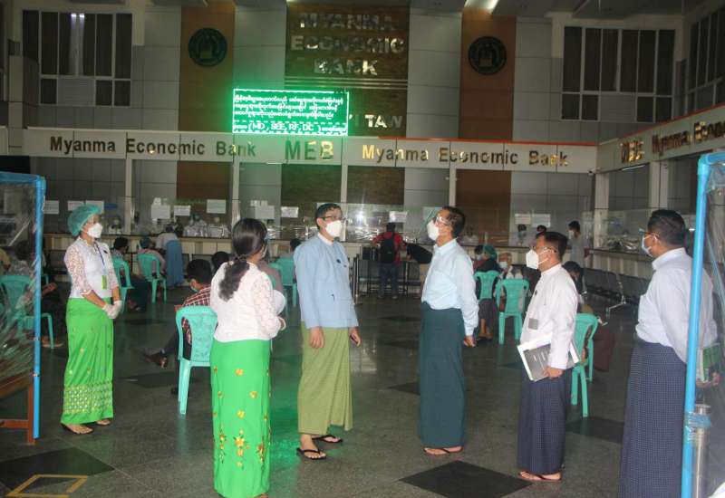 စီမံကိန်းနှင့် ဘဏ္ဍာရေးဝန်ကြီးဌာန ပြည်ထောင်စုဝန်ကြီး ဦးဝင်းရှိန်သည် ယနေ့နံနက် ၁၁ နာရီတွင် နေပြည်တော်ရှိ မြန်မာ့စီးပွားရေးဘဏ် (ရုံးချုပ်)၊ ပျဉ်းမနားမြို့နယ်ရှိ မြန်မာ့စီးပွားရေးဘဏ်နှင့် မြန်မာ့လယ်ယာ ဖွံ့ဖြိုးရေးဘဏ်၊ ပုဗ္ဗသီရိမြို့နယ်ရှိ မြန်မာ့စီးပွားရေးဘဏ် တို့သို့ သွားရောက်၍ ဘဏ်များ၌ ငွေသွင်း/ငွေထုတ် ဆောင်ရွက်နေမှုများ၊ အစိုးရဌာနအဖွဲ့ အစည်းများသို့ လစာနှင့်အသုံးစရိတ်များ ထုတ်ပေးနေမှုနှင့် ဘဏ်လုပ်ငန်း ဆောင်ရွက်နေမှုများကို ကြည့်ရှုစစ်ဆေးသည်။