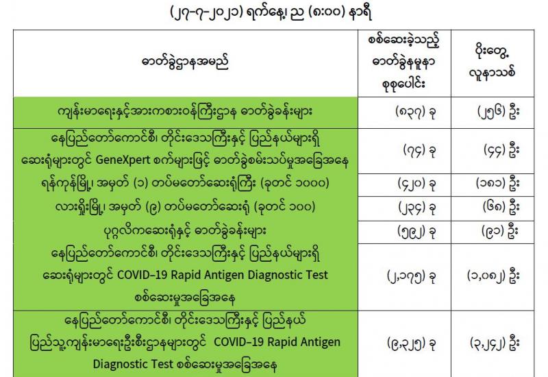 (၂၆-၇-၂၀၂၁)ရက်နေ့၊ ည (၈:၀၀)နာရီမှ (၂၇-၇-၂၀၂၁)ရက်နေ့၊ ည (၈:၀၀)နာရီအတွင်းဓာတ်ခွဲနမူနာစုစုပေါင်း(၁၃,၆၅၇)ခုအား စစ်ဆေးပြီးစီးခဲ့ရာCOVID-19 ရောဂါဓာတ်ခွဲအတည်ပြုလူနာသစ်(၄,၉၆၄)ဦးတွေ့ရှိရပါသည်။သို့ဖြစ်ပါ၍ ယနေ့အထိ ဓာတ်ခွဲနမူနာစုစုပေါင်း(၃,၁၀၂,၆၈၈)ခုအား စစ်ဆေးခဲ့ပြီး COVID-19 ဓာတ်ခွဲအတည်ပြုလူနာ စုစုပေါင်း (၂၇၉,၁၁၉) ဦး ရှိပြီ ဖြစ်ပါသည်။