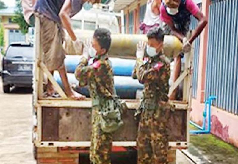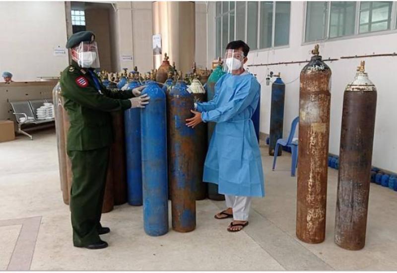 ကိုဗစ်-၁၉ ရောဂါဓာတ်ခွဲအတည်ပြု ပိုးတွေ့လူနာများနှင့် သီးသန့်စောင့် ကြည့်ရမည့်သူများကို ကုသရေးလုပ်ငန်းများ ဆောင်ရွက်ရာတွင် အောက်ဆီဂျင် လိုအပ်ချက်များကို တစ်ဖက်တစ်လမ်း မှ အထောက်အကူပြုစေရန်အတွက် တပ်မတော်နှင့် အလှူရှင်များက အောက်ဆီဂျင်အိုးများကို တိုင်းဒေသကြီးနှင့် ပြည်နယ်အသီးသီးရှိ ပြည်သူ့ဆေးရုံများ၊ တပ်မတော်ဆေးရုံများ၊ ကျန်းမာရေးဌာနများနှင့် ကိုဗစ်စင်တာများသို့ ပေးပို့လှူဒါန်းလျက်ရှိသည်။