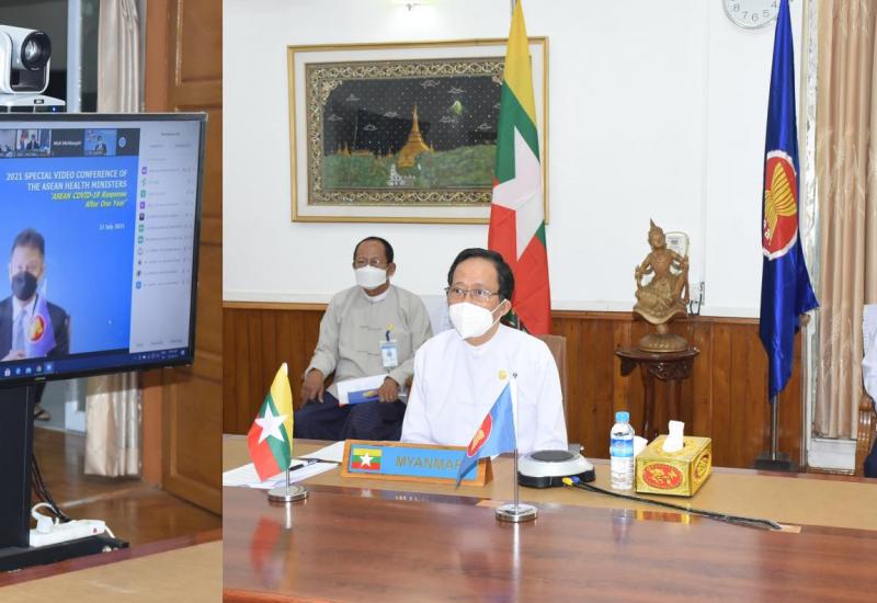 ကျန်းမာရေးနှင့် အားကစားဝန်ကြီးဌာန ပြည်ထောင်စုဝန်ကြီး ဒေါက်တာ သက်ခိုင်ဝင်းသည် ယနေ့နံနက်ပိုင်းတွင် တစ်နှစ်အကြာ ကိုဗစ်-၁၉ ရောဂါ တုံ့ပြန်ရေး ၂၀၂၁ အထူးဗီဒီယို ကွန်ဖရင့် Special VIDEO Conference of the 2021 ASEAN Health Ministers on “ASEAN COVID-19 Response after One Year” ကို ကျန်းမာရေးနှင့် အားကစားဝန်ကြီးဌာန ပြည်ထောင်စုဝန်ကြီး ဧည့်ခန်းမမှ တက်ရောက်ဆွေးနွေးသည်။