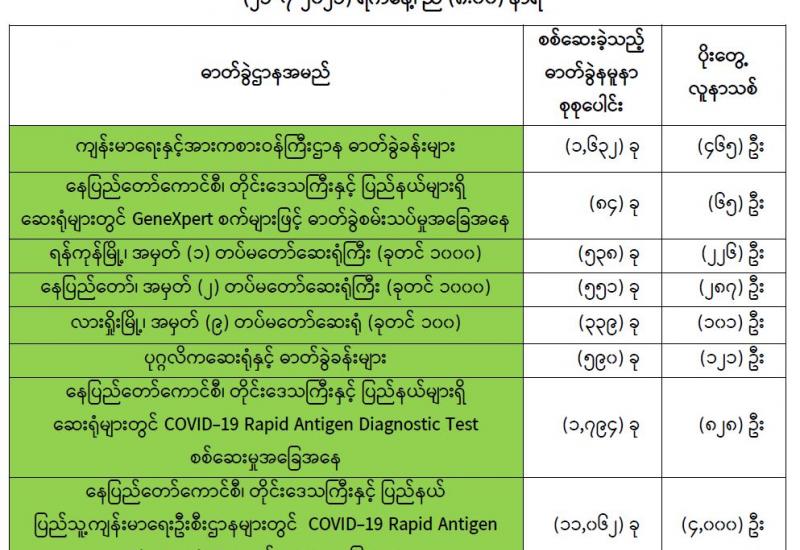 ပြည်သူလူထုအတွက် အဓိကအကျဆုံးဖြစ်သော ကျန်းမာရေးကဏ္ဍ မြင့်မားရေးအတွက် တပ်မတော် မှ ပါရဂူများ၊ ဆေးမှူးများ၊ သူနာပြုများဖြင့် ဝိုင်းဝန်း ကူညီဆောင်ရွက်ပေးလျက်ရှိသည့်အပြင် ပြည်သူ လူထု၏ အရေးပေါ်ကျန်းမာရေး ဆိုင်ရာကုသမှုများ ဆောင်ရွက်ပေးနိုင်ရန်အတွက် တပ်မတော်ဆေးရုံများနှင့် ယာယီကုသရေးဆေးရုံများ၌ ကျန်းမာရေး စောင့်ရှောက်မှုများကို နေ့ညမပြတ်ဆောင်ရွက်ပေး လျက်ရှိရာ ဖေဖော်ဝါရီ ၅ ရက်မှ ယနေ့အထိ ပြင်ပ လူနာပေါင်း ၂၇၃၄၄၂ ဦးနှင့် အတွင်းလူနာပေါင်း ၇၉၅၆၀ ဦးတို့ကို ကုသပေးနိုင်ခဲ့သည်။