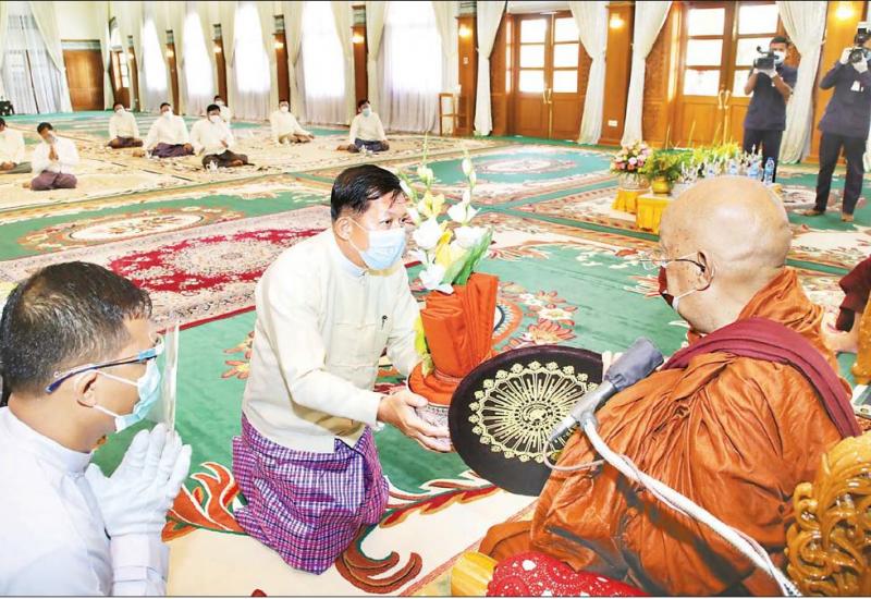၂၀၂၁ ခုနှစ်၊ ကာကွယ်ရေးဦးစီးချုပ်ရုံး(ကြည်း၊ ရေ၊ လေ) မိသားစုများ ဝါဆို သင်္ကန်းဆက်ကပ်လှူဒါန်းပွဲ အခမ်းအနားကို ယနေ့နံနက်ပိုင်းတွင် ကာကွယ်ရေးဦးစီး ချုပ်ရုံး(ကြည်း) အနော်ရထာခန်းမ၌ ကျင်းပပြုလုပ်ရာ နိုင်ငံတော်စီမံအုပ်ချုပ်ရေး ကောင်စီဥက္ကဋ္ဌ တပ်မတော်ကာကွယ်ရေးဦးစီးချုပ် ဗိုလ်ချုပ်မှူးကြီး မင်းအောင်လှိုင် က ဝါဆိုသင်္ကန်း၊ လှူဖွယ်ပစ္စည်းများနှင့် နေ့ဆွမ်းတို့ကို ဆက်ကပ်လှူဒါန်းသည်။