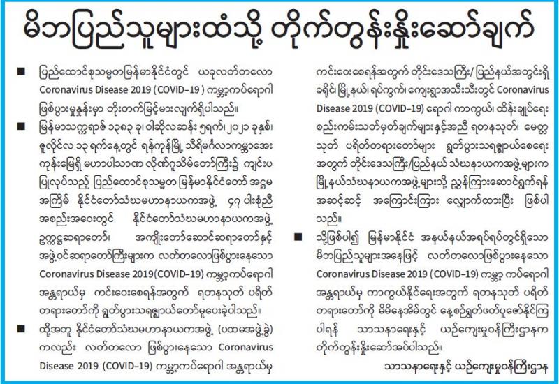 နိုင်ငံတစ်ဝန်းလုံးအတိုင်းအတာဖြင့် နေပြည်တော်ကောင်စီအပါအဝင် တိုင်းဒေသကြီး၊ ပြည်နယ်အသီးသီးမှ စေတနာ့ဝန်ထမ်းများအတွက် ကိုဗစ်-၁၉ ရောဂါ ကာကွယ်၊ထိန်းချုပ် တုံ့ပြန်ရေး လုပ်ငန်းစဉ်များနှင့်ပတ်သက်ပြီး လုပ်ငန်းဆိုင်ရာကျွမ်းကျင်မှုသင်တန်းကို အွန်လိုင်း စနစ်ဖြင့် ယနေ့နံနက် ၉ နာရီခွဲတွင် ကျင်းပသည်။