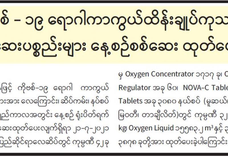 ကိုဗစ်-၁၉ ရောဂါ ကာကွယ်ထိန်းချုပ်ကုသရေး လုပ်ငန်းများတွင် အောက်ဆီဂျင် လိုအပ်ချက်များကို အထောက်အကူဖြစ်စေရန်အတွက် မြန်မာစီးပွားရေးကော်ပိုရေးရှင်း စက်ရုံများမှထုတ်လုပ်သော အောက်ဆီဂျင်ဓာတ်ငွေ့များအား သက်ဆိုင်ရာ နယ်မြေဒေသအသီးသီးရှိ ဆေးရုံများနှင့် ကိုဗစ်ကုသရေးစင်တာများသို့ နေ့စဉ် ဖြန့်ဖြူးပေးလျက်ရှိကြောင်း သိရသည်။